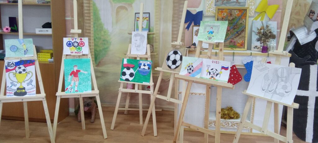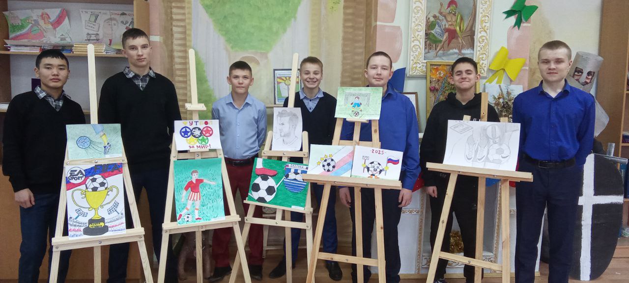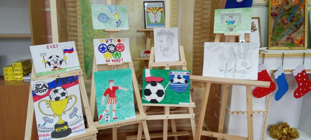 В конкурсе принимали участие ученики 5-11 классов. Кроме рисунков на выставке представлена работа «Футбольный мяч», выполненная в необычной технике «Стринг-арт».
