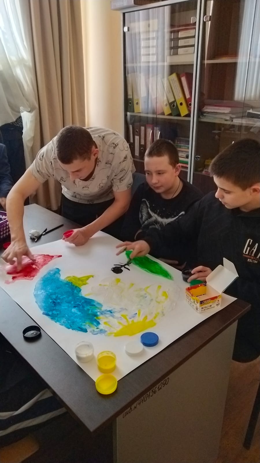 - «Рождественский шар» — это увлекательное творческое занятие с пальчиковыми красками во время которого участники, разделенные на команды, раскрашивают большие, нарисованные на ватмане, рождественские шары для ёлки.