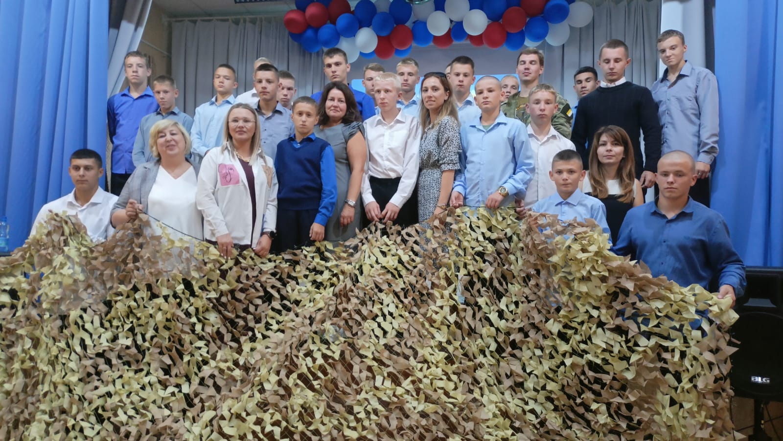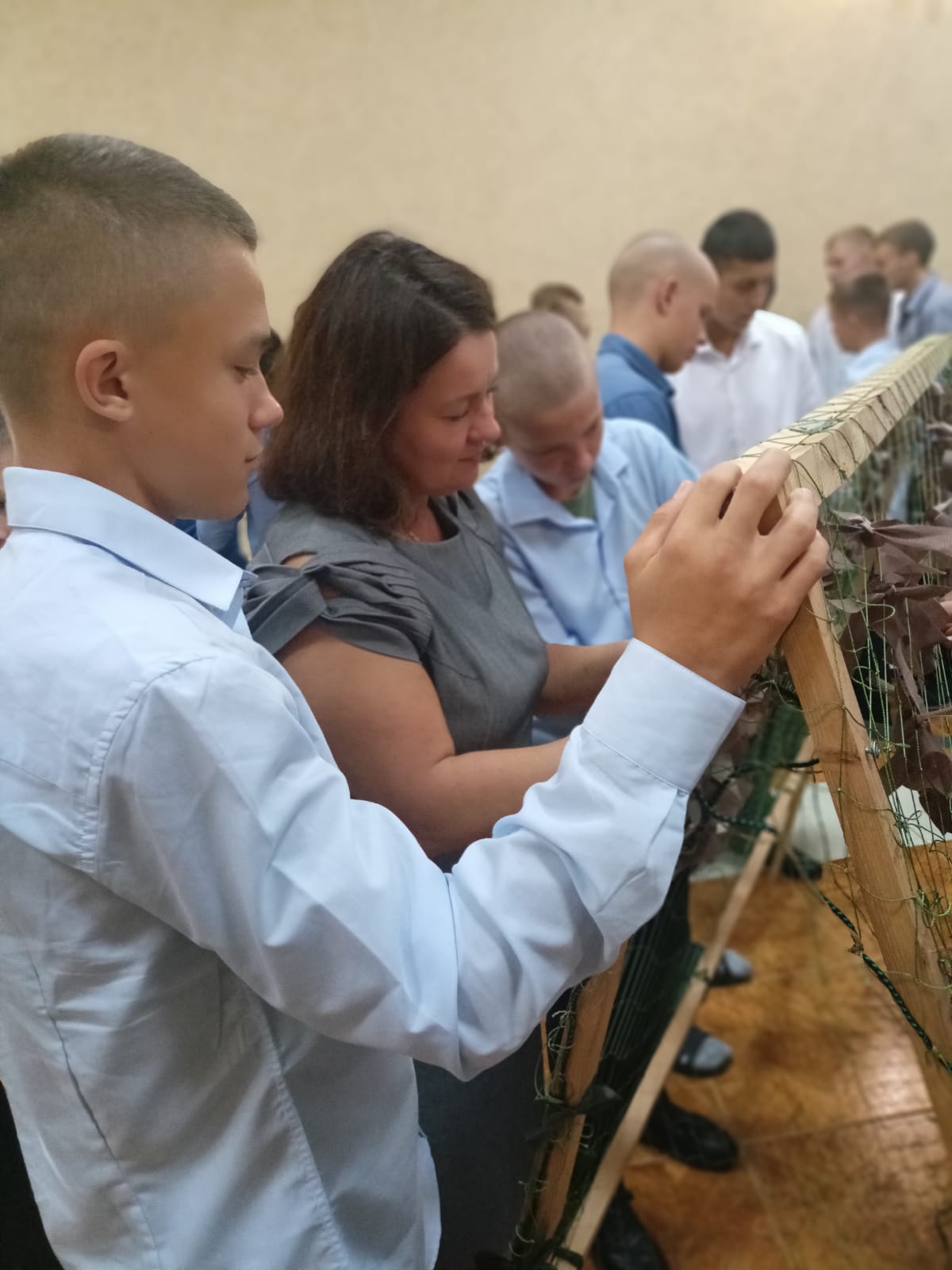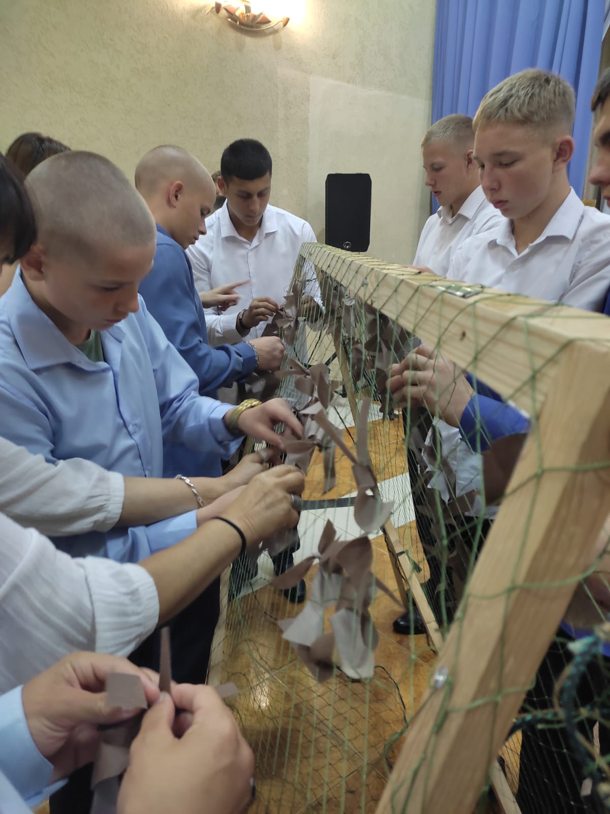 Далее мы перешли ко второй части нашей встречи, где участники волонтерского движения «Листва прикроет ZVO» рассказали всем присутствующим о своей деятельности, о необходимости маскировочных сетей на фронте и предложили всем попробовать вплести ленточки в сеть. За час наши ребята почти полностью сплели сеть, показали свою заинтересованность и желание помогать.