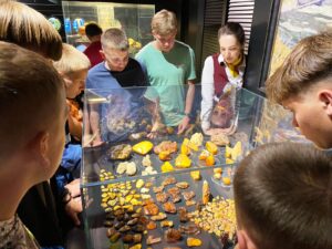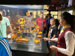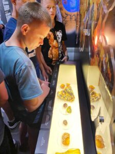 После наша группа отправилась в интерактивный выставочный зал под названием «Янтарная палата», который расположен в музее Янтарного Комбината. В экспозициях музея ребята увидели: происхождение, ископаемые смолы, технологии добычи и обработки балтийского янтаря, уникальные образцы «солнечного камня» (коллекция крупных самородков), технологии промышленной переработки янтаря и его имитации.