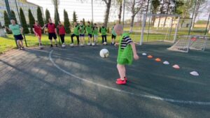 2. Ведение мяча с обводкой стоек в количестве 5 штук на время. Лучший результат - у Калинина А. , 9 класс. Время его прохождения 8,1 сек.