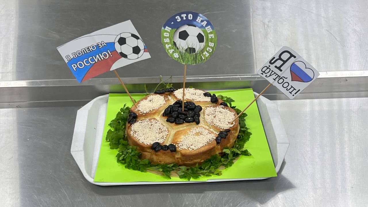 Одним из самых впечатляющих творений стал заливной пирог в виде футбольного мяча. Этот шедевр выглядит как настоящий мяч на траве: круглая форма, аккуратно вырезанные шестиугольники и пятиугольники, имитирующие панели мяча. Поверхность пирога выполнена из оливок и кунжута, чтобы максимально точно передать классический дизайн футбольного мяча.