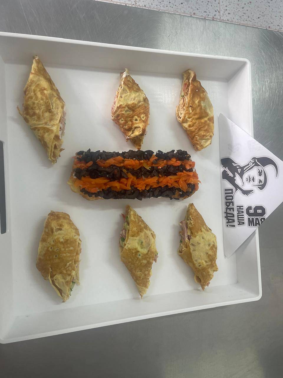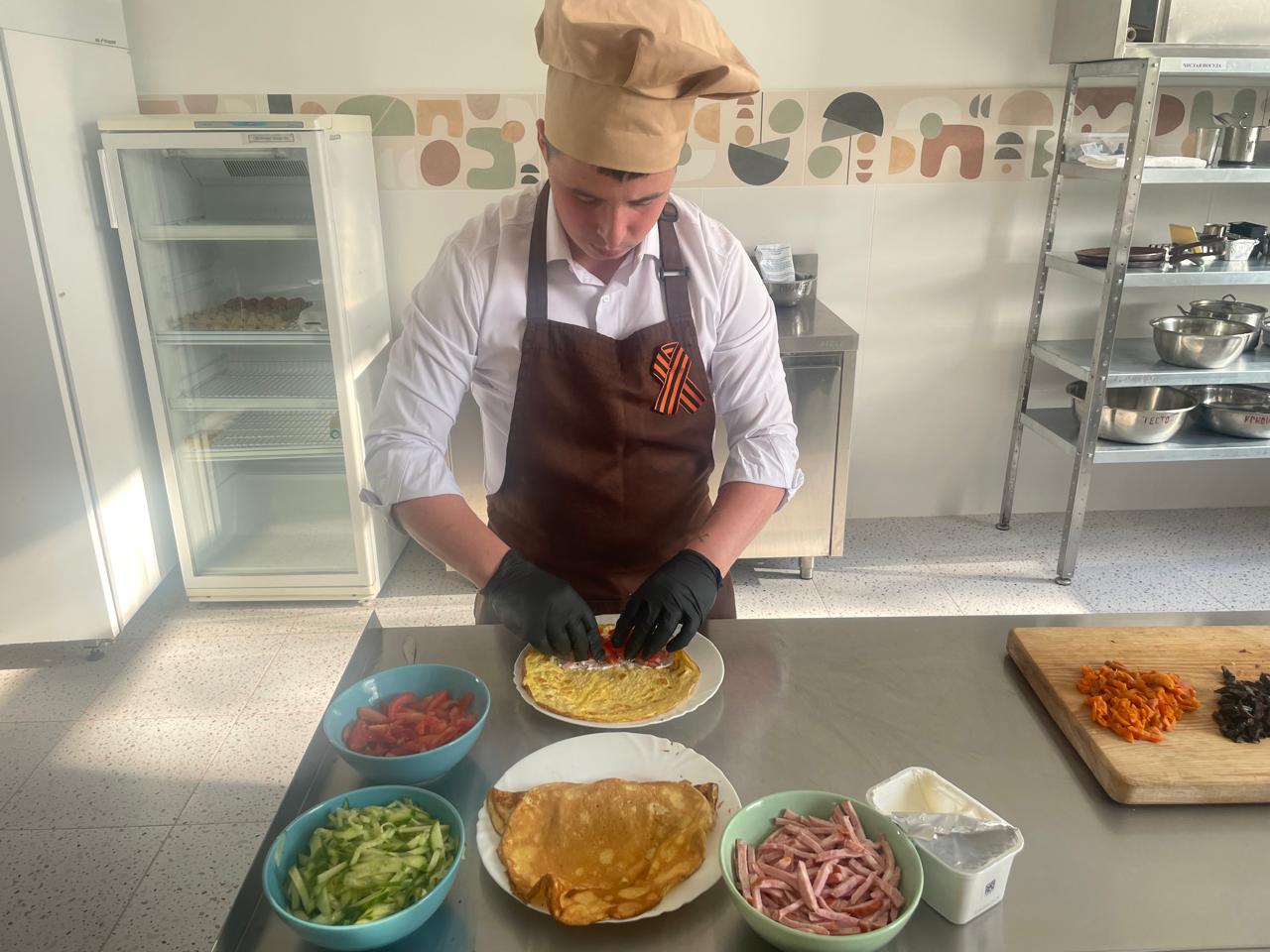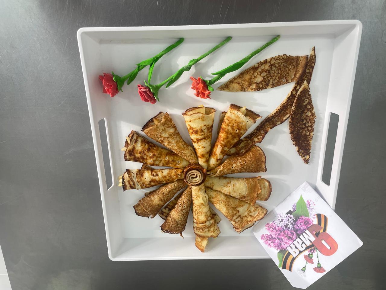 В преддверии великого праздника – Дня Победы – ребята решили приготовить необычное, но символичное блюдо: **блинный рулет с начинкой в цветах георгиевской ленты**.