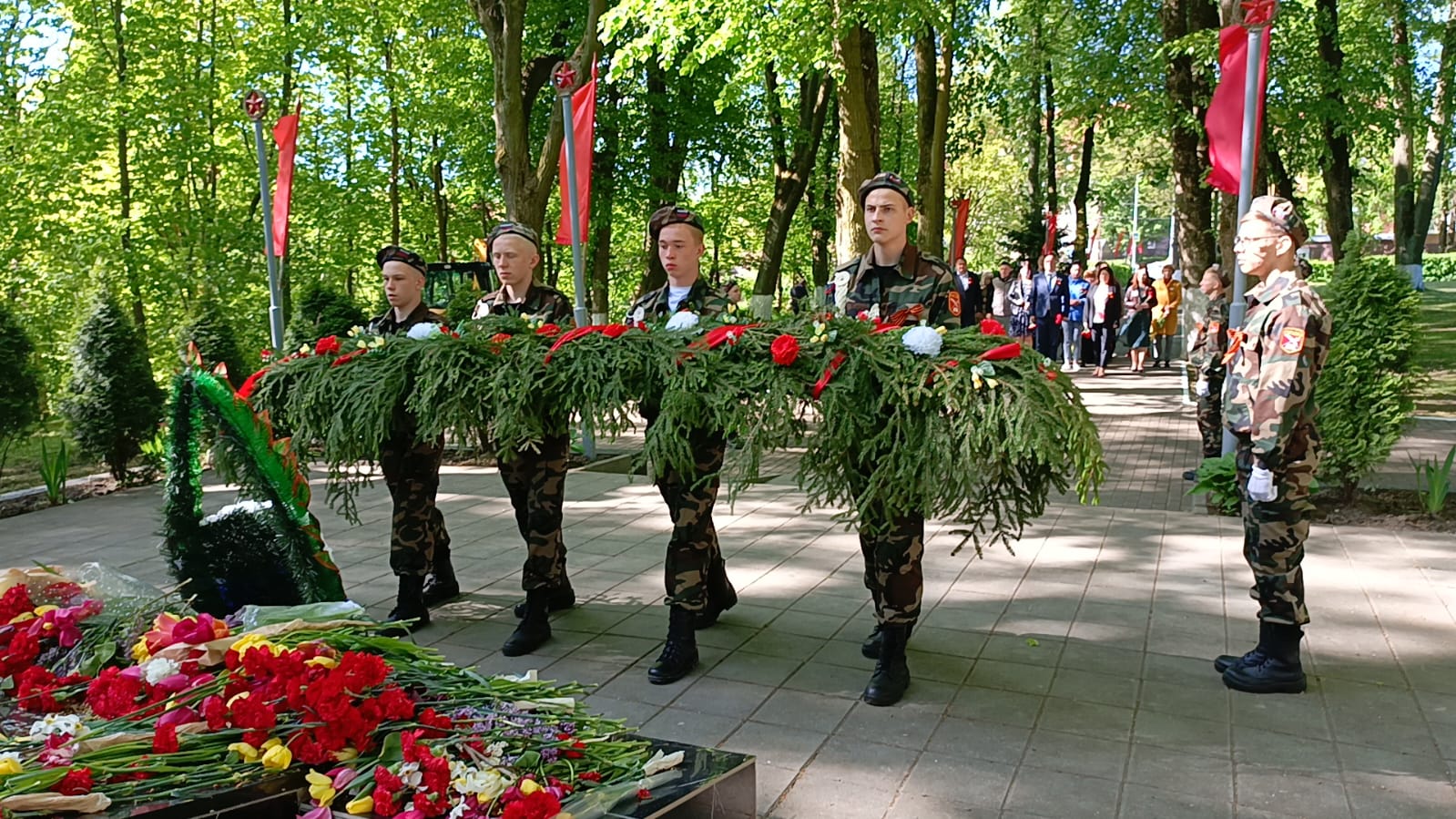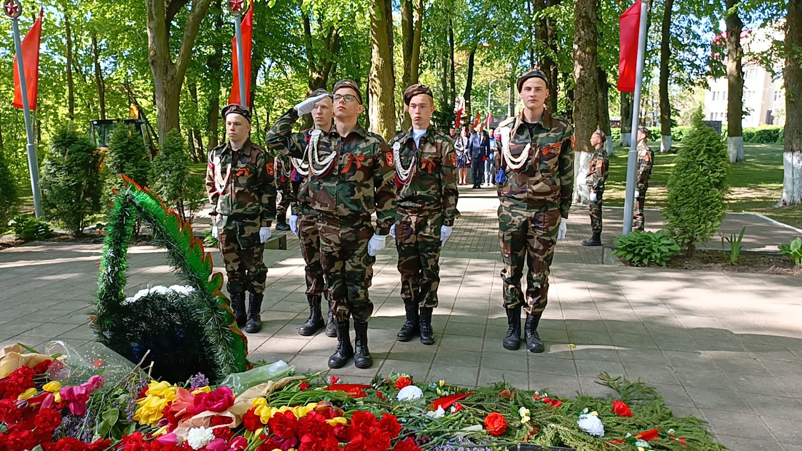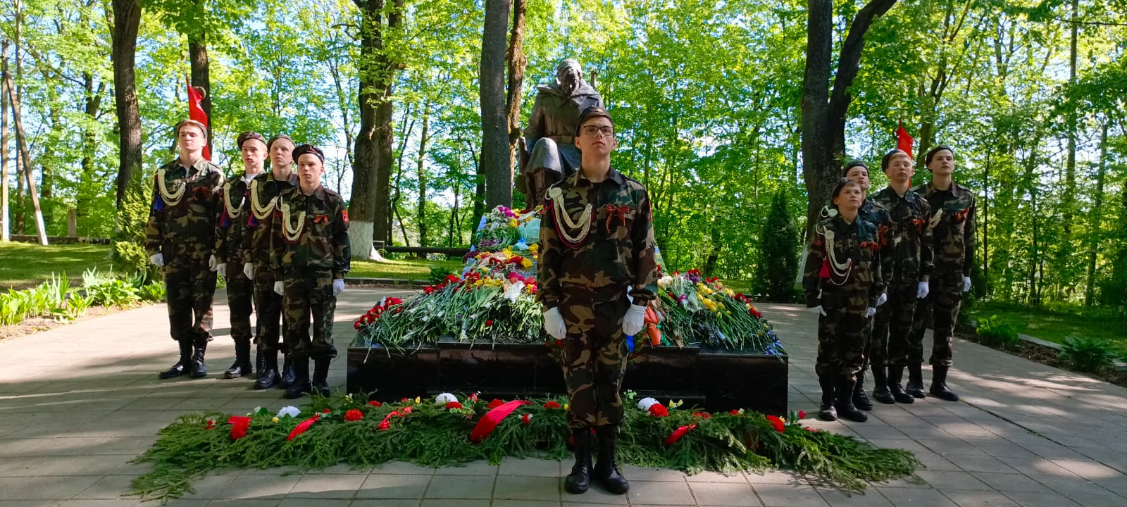 Возложение цветов к памятникам воинам, погибшим во время Великой Отечественной войны — это дань светлой памяти защитникам Родины, а также выражение глубочайшей признательности, огромного уважения и благодарности всем, кто не вернулся с полей сражений в годы войны.