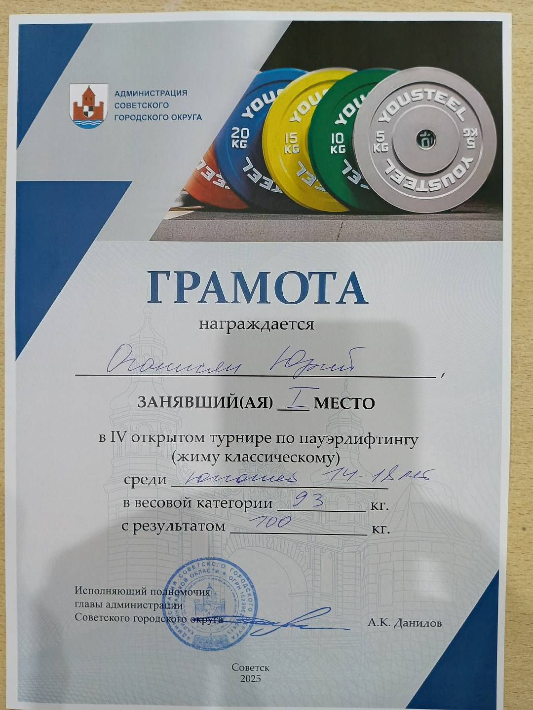 Юру поздравили с эти событием сотрудники и обучающиеся Неманского СУВУ, а директор Катаева Анна Васильевна вручила ему первый его спортивный документ, зачетную классификационную книжку спортсмена в которой указаны его достижения.