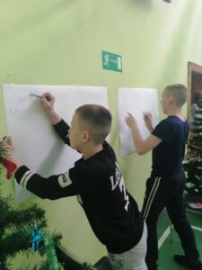 Команды наряжали елку, изготавливали из воздушных шаров снеговика, играли в «снежки», сдували снежинки, катались на импровизированных санках, а финальным соревнованием было, написать на подготовленных плакатах свое пожелание в Новом году.