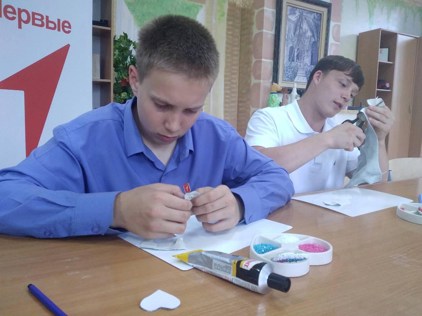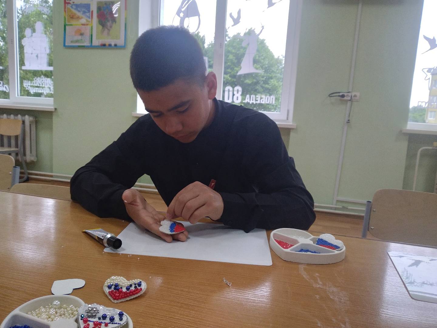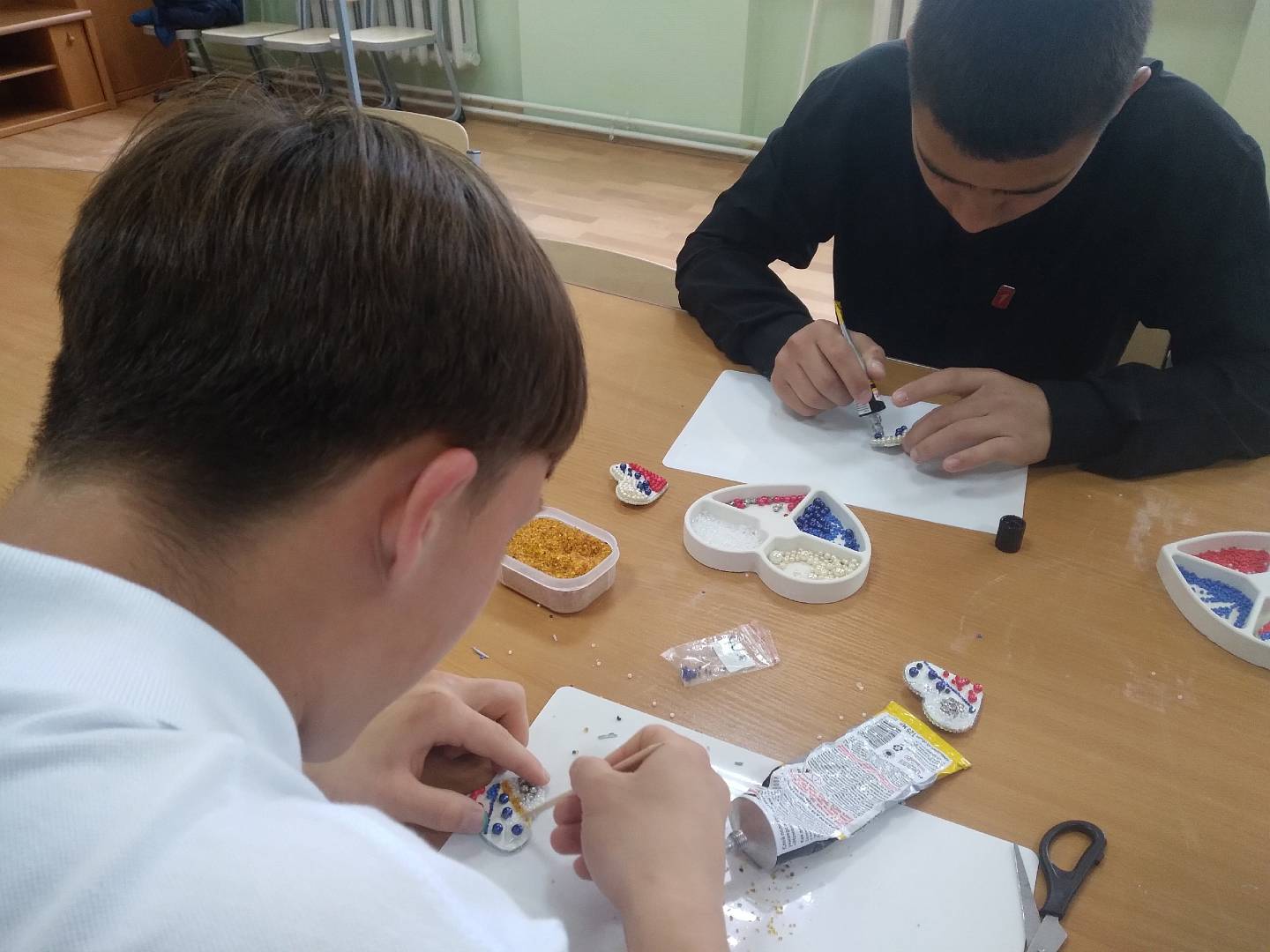 Брошь делали, используя натуральную кожу, блестящие стразы, бусины и бисер. Цвета Российского флага были выбраны не случайно, ведь именно флаг является самым главным отличительным символом государства. Каждый участник выразил свою креативность и фантазию. Под чутким руководством преподавателя все ребята легко справились со всеми этапами создания нарядной броши. Экспертом в создании креативной броши выступила директор учреждения Анна Васильевна, отметив оригинальность, творческий подход, аккуратность и усидчивость ребят.