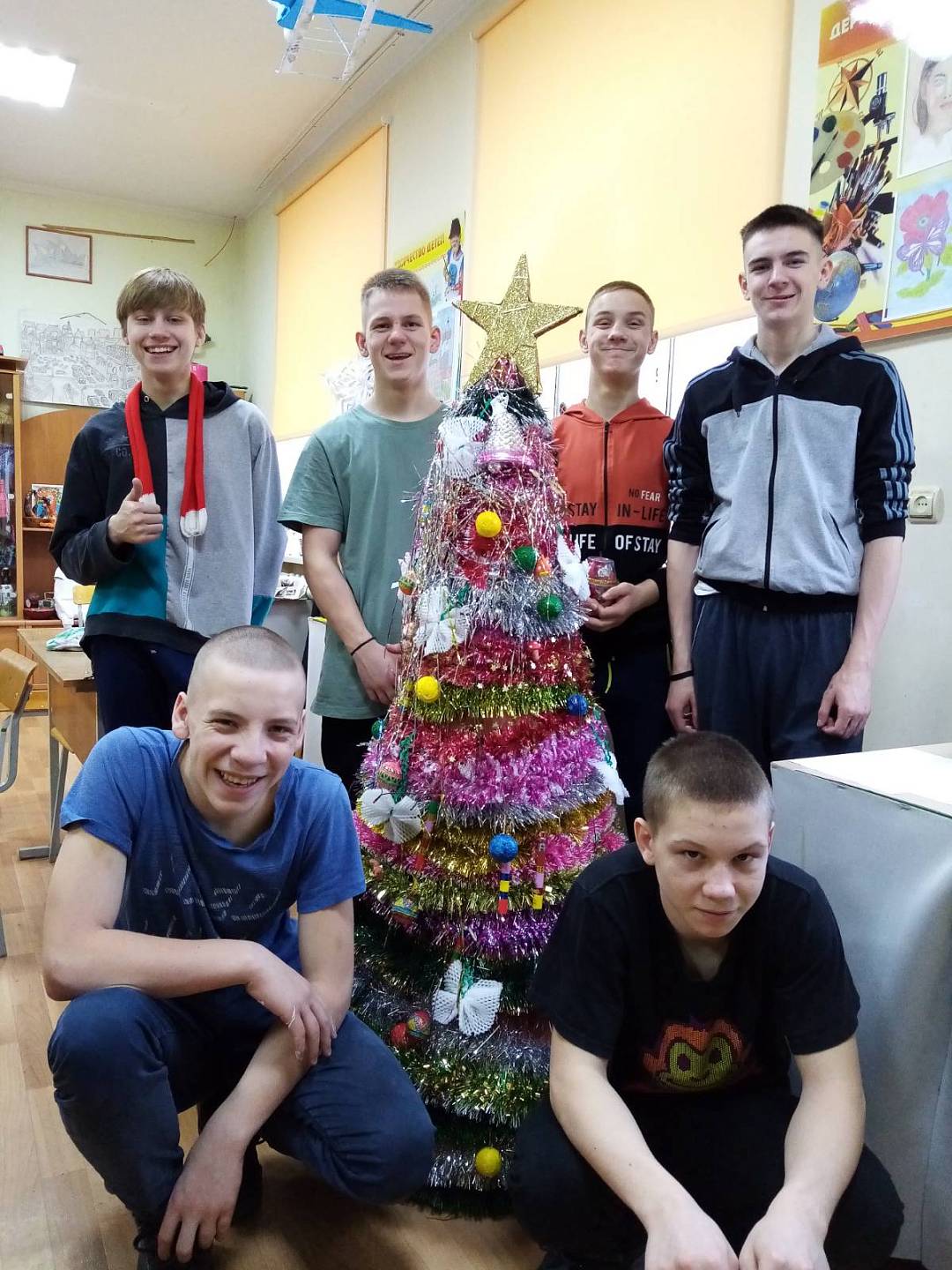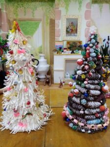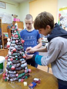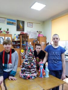 Педагог М.С. Банит собрала всех ребят, желающих проявить своё творчество в создании необычных дизайнерских ёлок. Споров было не мало: в каком стиле, из какого материала, какой техникой работать…Команды посовещались, выбрали свой путь создания и закипела работа! Никто не заметил, как пролетели три часа работы, но итог вдохновил и порадовал всех! Ведь этими ёлками затем ребята украсили свои игровые комнаты общежития.