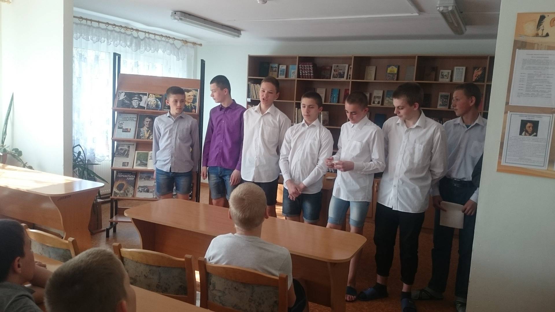 Гагарине «Звёздный сын земли» с целью расширения знаний об истории освоения космоса человеком и воспитания у подростков интереса к истории России. В библиотеке оформлена выставка, посвящённая Всемирному дню авиации и космонавтики. Педагог-библиотекарь Людмила Николаевна Ковалёва рассказала о жизненном пути Ю.А. Гагарина, о том, что в детские годы Юра был обыкновенным ребенком, мечтал стать лётчиком. Но первой профессией, которую избрал для себя будущий космонавт, была профессия металлурга. Присутствующие с интересом полистали книги, представленные на книжной выставке, посвященной 85-летию со дня рождения первого космонавта Ю. А. Гагарина. Далее слово передали обучающимся: они прочитали (наизусть и выразительно) стихи, посвящённые Дню космонавтики. Затем, Людмила Николаевна провела с ребятами викторину по теме "Космос", где они достаточно активно и заинтересованно приняли участие и отвечали на вопросы.