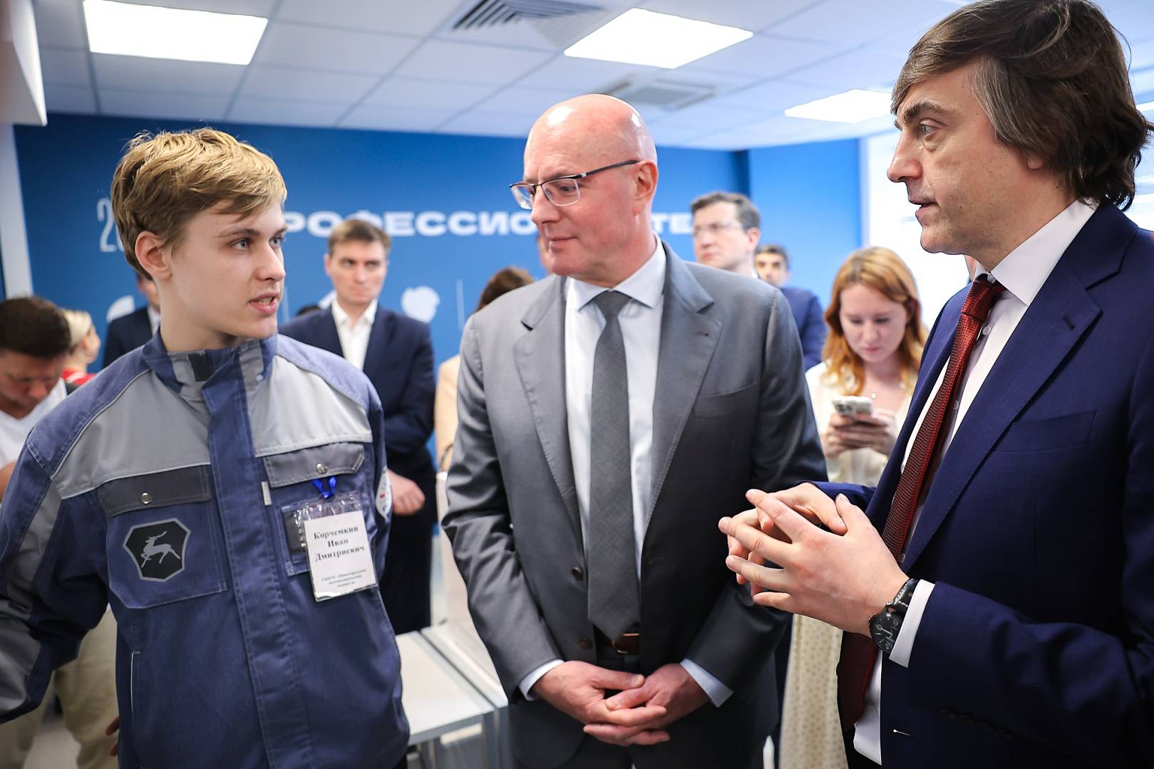 Заместитель Председателя Правительства России Дмитрий Чернышенко, Министр просвещения РФ Сергей Кравцов и губернатор Нижегородской области Глеб Никитин посетили Нижегородский автомеханический техникум (НАМТ).