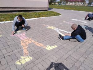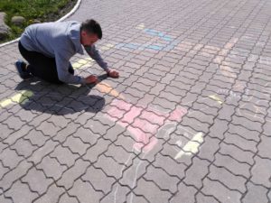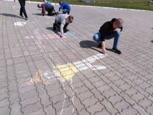 Затем с помощью цветного мела и хорошего настроения ребята создавали свои шедевры на асфальте. «Я в первомай!» - тема рисунков на асфальте. Сначала каждый изобразил в рисунке себя, а затем решили объединиться и создали общий проект по типу русской матрёшки. Все участники конкурса смогли уместиться в контуре Алексея Королёва.