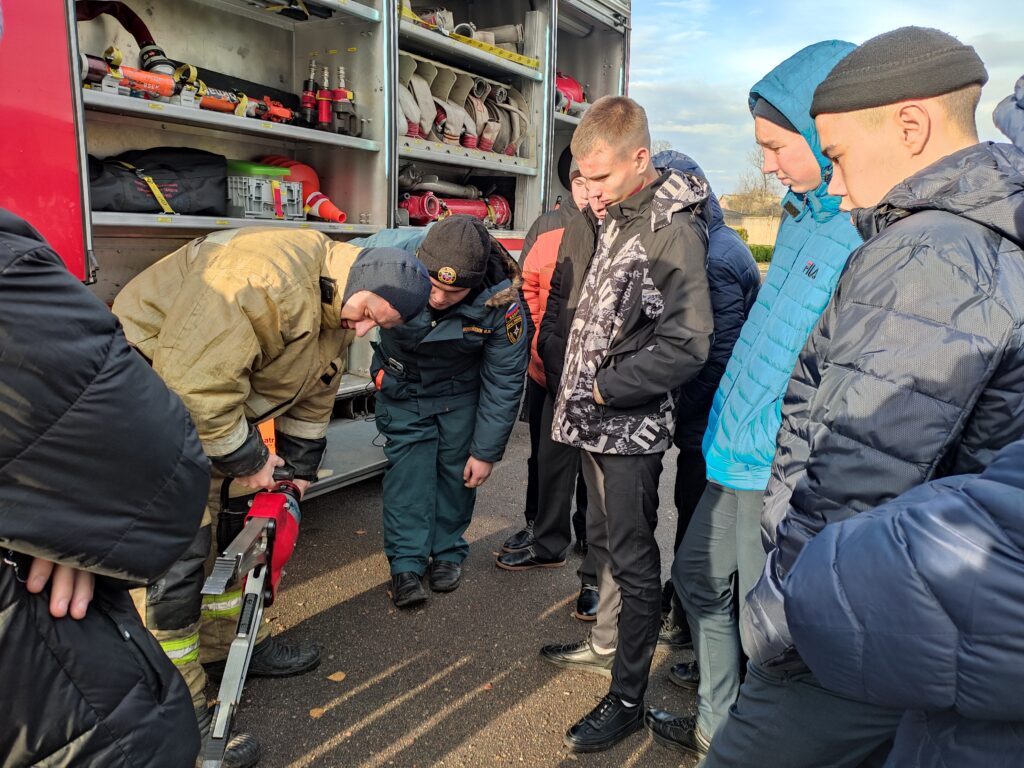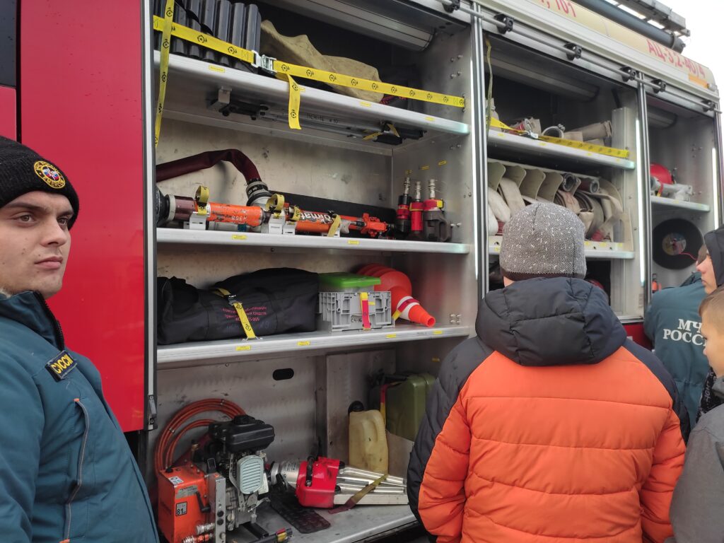 Также были организованы сотрудниками пожарной части рассказ и показ о строении пожарной машины. Они продемонстрировали, как выглядит пожарная машина изнутри, где находится бак, который заполняется водой, какими приспособлениями пользуются пожарные. Как выглядят пожарные рукава и другие, столь нужные спасателям инструменты, необходимые при пожаре, рассказал об их назначении. Дети увидели спасательные аппараты, которые огнеборцы используют в задымленных местах. Закрепили знания о том, как надо вести себя при возникновении пожара, правила пожарной безопасности и поведения. Как правильно набирать номер телефона и сообщать о пожаре. Ребятам даже разрешили посидеть в пожарной машине. Дети узнали, сколько человек выезжает на такой машине в случае пожара.