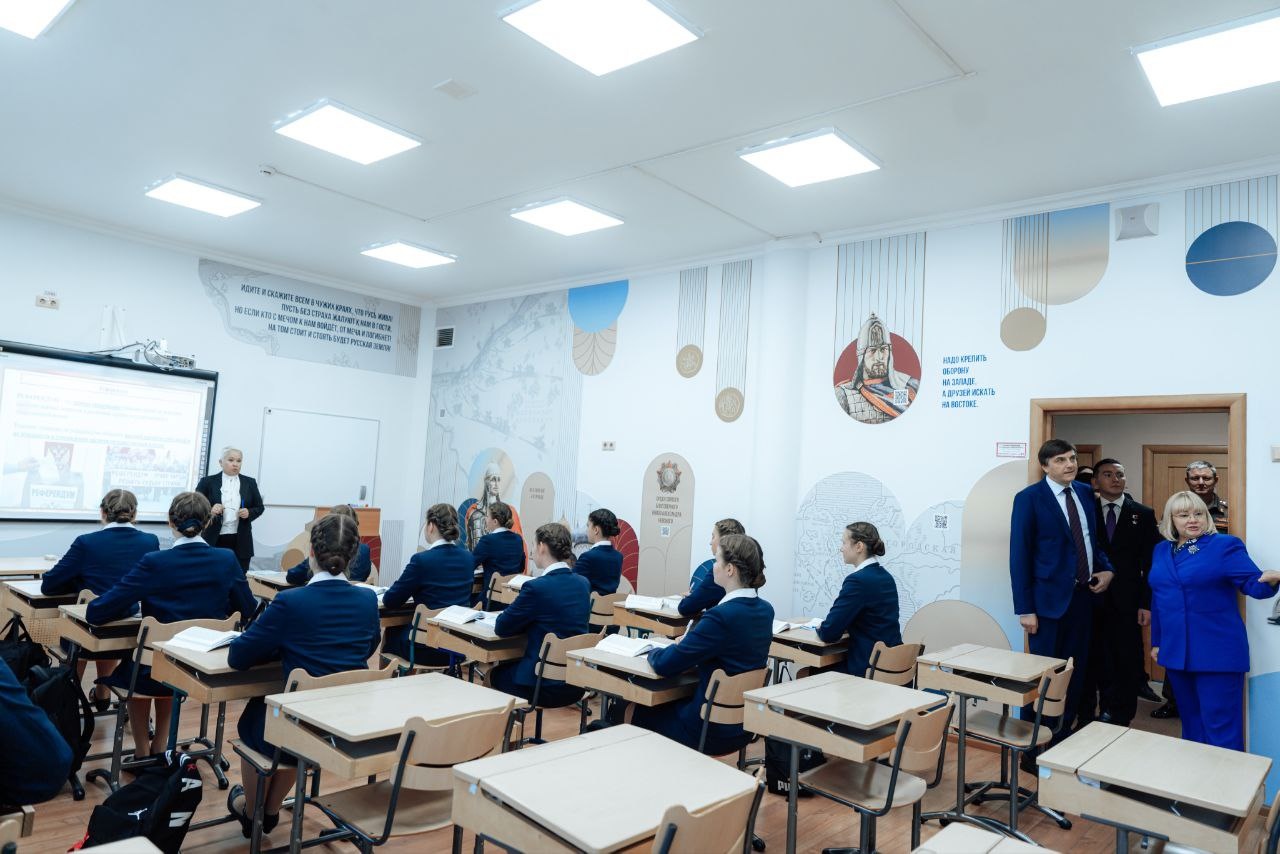 В Пансионе воспитанниц Минобороны России глава Минпросвещения РФ Сергей Кравцов ознакомился с медицинским, инженерным, финансово-экономическим, историко-лингвистическим классами, учебными аудиториями и лабораториями.