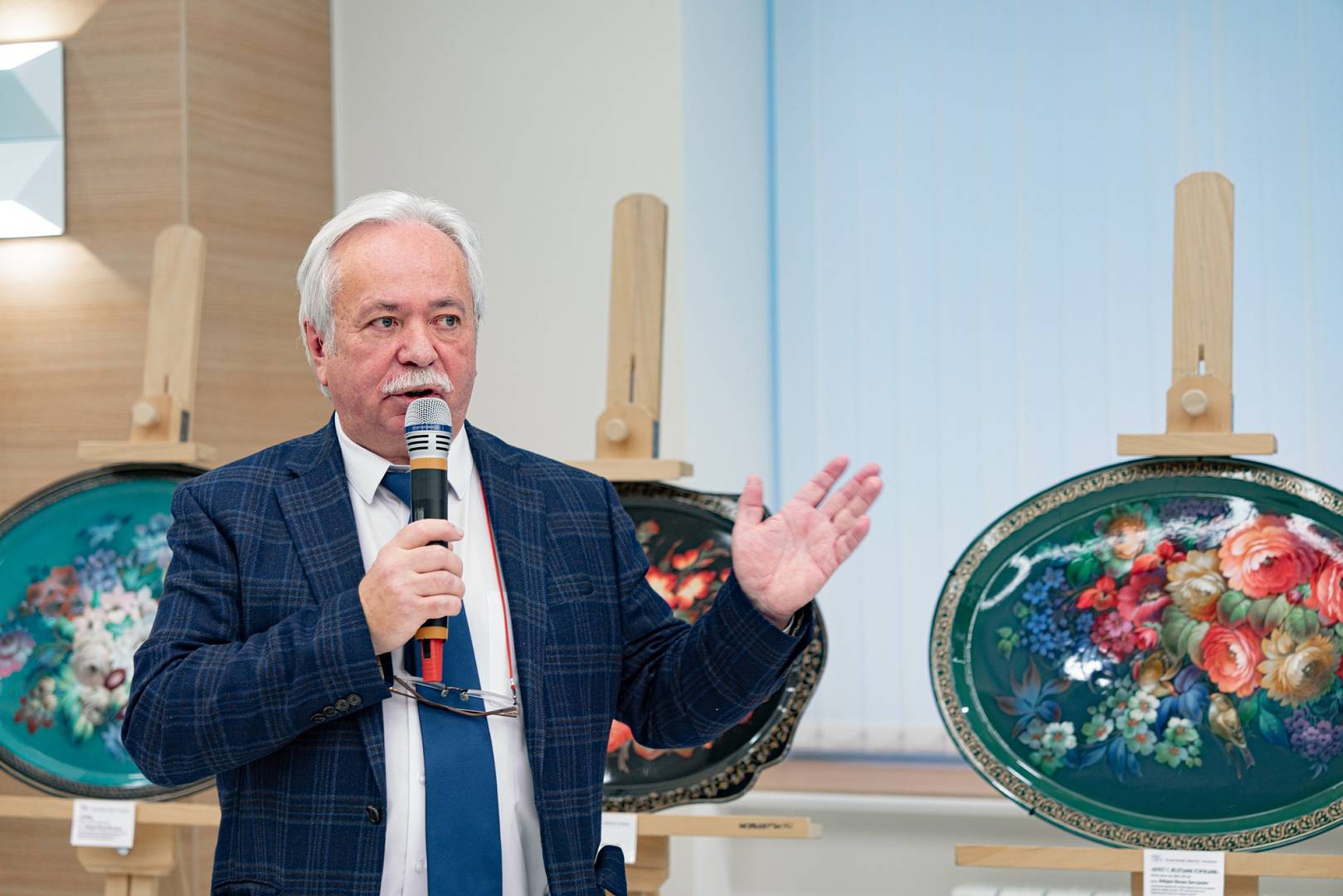 Заслуженный художник Российской Федерации, член-корреспондент Российской академии художеств Михаил Лебедев, главный художник Жостовской фабрики декоративной росписи, руководитель мастерской жостовской декоративной росписи и выпускник Университета просвещения, объяснил тонкости техники живописи, особенности изготовления подносов и символические значения элементов работ. По его словам, есть определенный алгоритм расположения цветов и наложения красок, но у каждого мастера свой индивидуальный почерк.