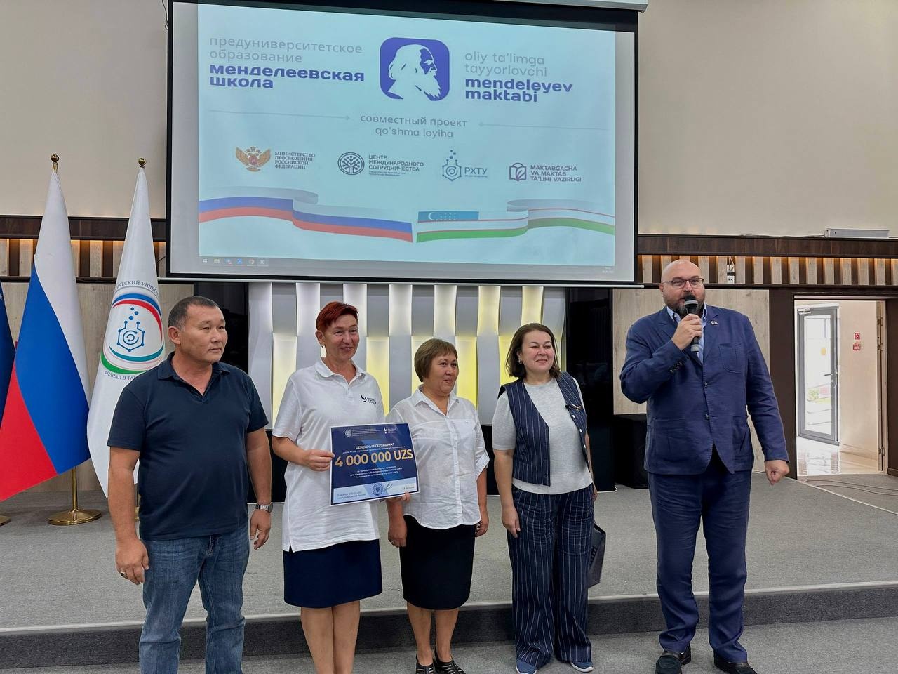 На первом этапе проект охватывает три образовательные организации Мирзо-Улугбекского района Ташкента – школы № 187, 208 и 210. Обучать химии и биологии на русском языке будут семь педагогов – участников проекта «Российский учитель за рубежом». В рамках торжественной церемонии директорам и педагогам школ, где будет реализовываться образовательная модель «Менделеевская школа», были вручены сертификаты на приобретение расходных материалов для лабораторных и практических работ, а также комплекты учебной литературы для классов химии и биологии.