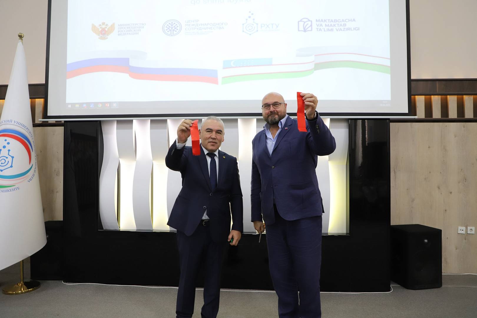 Директор Центра международного сотрудничества Минпросвещения России Сергей Малышев и исполнительный директор филиала РХТУ им. Д.И. Менделеева Батыр Нурматов перерезали символическую красную ленту, дав старт проекту.