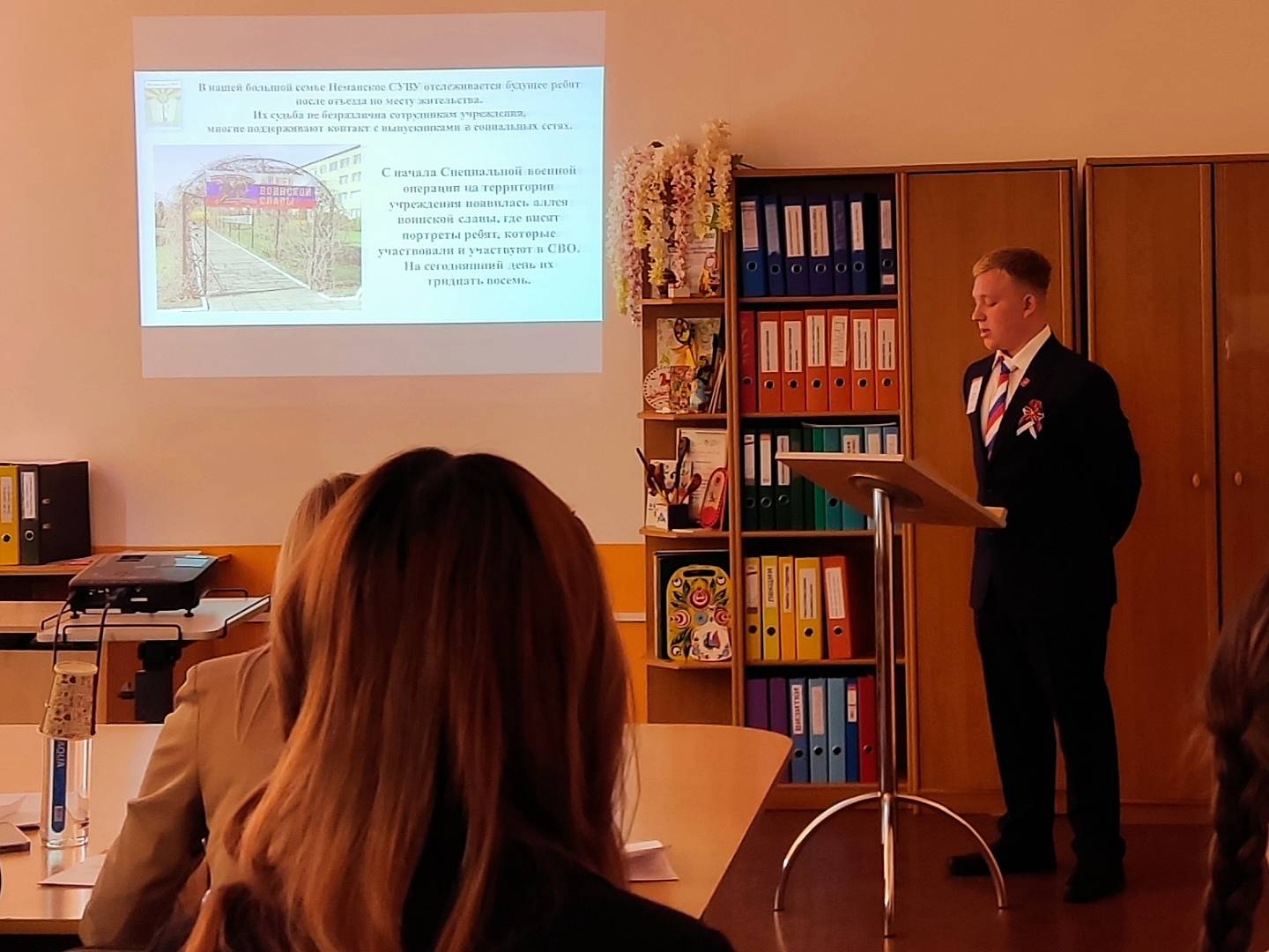 На конференции Виктор выступил с докладом на тему «Нет в России семьи такой, где не памятен был свой герой», в котором рассказал о дружной семье «Неманское СУВУ», в которой судьба своих выпускников не безразлична сотрудникам учреждения и многие поддерживают контакт с ними в социальных сетях. Все присутствующие с интересом выслушали Виктора о том, что наши выпускники с честью и доблестью продолжают дело наших дедов в борьбе с реальным коварным и опасным врагом – националистами Украины и наемниками НАТО, и с начала Специальной военной операции, на территории учреждения появилась аллея воинской славы, где расположены портреты ребят, которые участвовали и участвуют в СВО. На сегодняшний день их тридцать восемь, пять погибших, трое пропавших без вести. О некоторых ребятах Виктор рассказал подробней, об их заслугах и наградах.