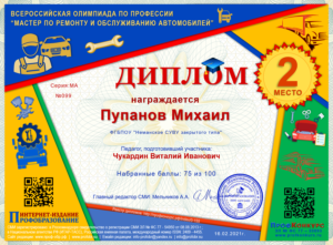 В ходе олимпиады обучающийся отвечал на 20 вопросов, которые содержали общее устройство, а также операции по техническому обслуживанию и ремонту автомобиля.