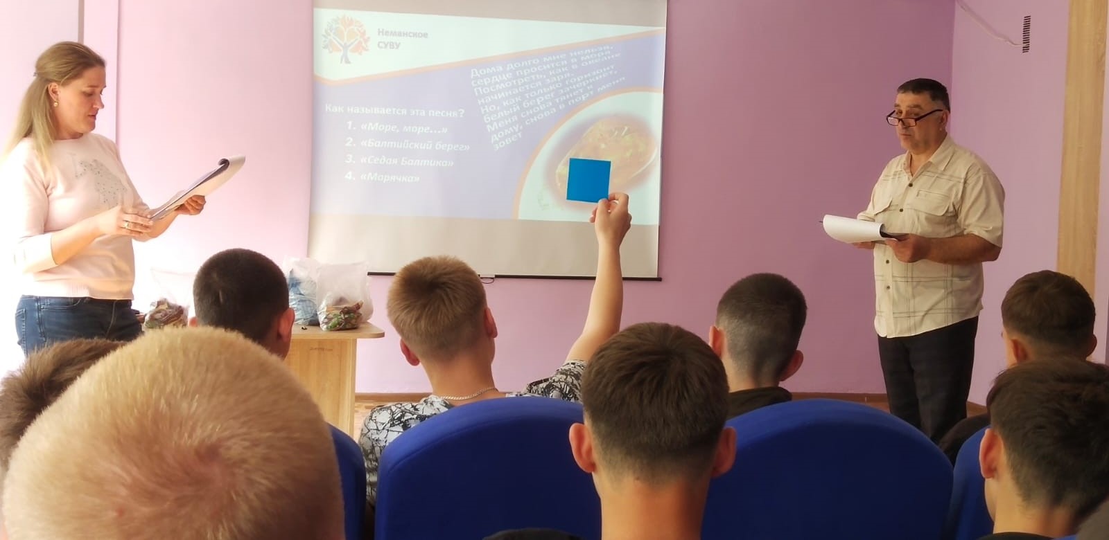 Педагоги-психологи Салаев Э.Э. и Соломина А.В. провели для обучающихся СУВУ комплексное психолого-педагогическое мероприятие, в которое входили такие актуальные формы как: синквейн «Время профессий», по тем профессиям, которым обучаются в СУВУ (тракторист, животновод, растениевод, слесарь) и музыкальный квиз «Наши романтики» по песням о Янтарном крае.