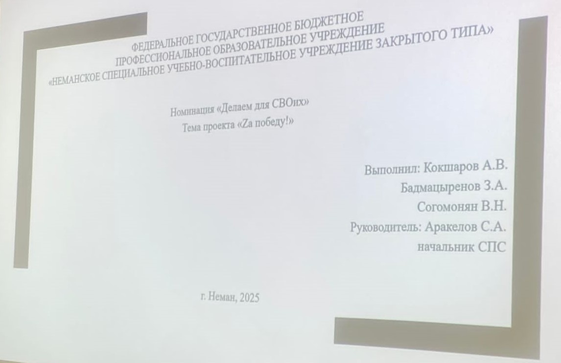 27 мая 2025 г. состоялась защита проектов. Обучающиеся Кокшаров А., Согомонян В. и Бадмацыренов З. защитили свой проект «Zа Победу!» в номинации «Делаем для СВОих», где подробно рассказали о полученных результатах. Руководитель проекта — Аракелов С.А.