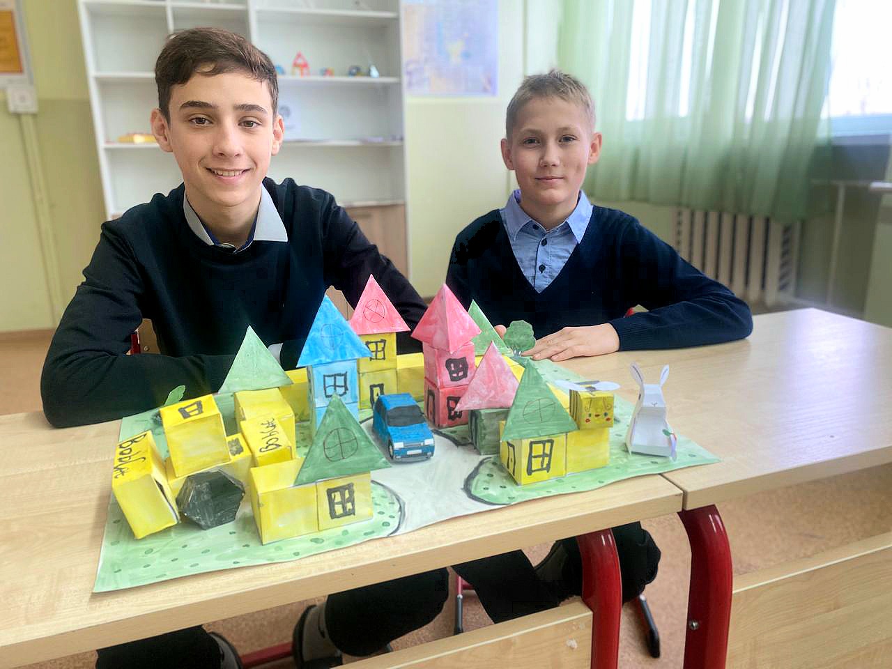 Параллельно в школе обучающиеся построили город из объёмных геометрических фигур. Над его созданием трудились ученики 7-9 классов. Этот проект помог на практике закрепить знания о стереометрии, развить пространственное мышление и показать, что геометрия окружает нас повсюду – от архитектуры до дизайна.