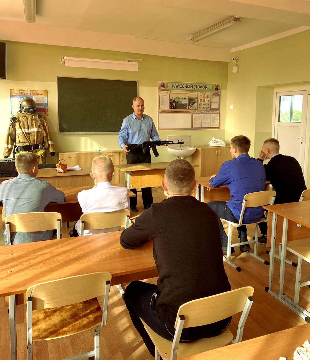 Учитель ОБЖ Вячеслав Александрович Д. познакомил ребят с устройством и принципом работы различных автоматических систем пожаротушения и правилами действий при возникновении пожара и эвакуации из помещений учреждения, провел урок начальной военной подготовки – по теме «Устройство АК-74 (неполная разборка и сборка АК-74 (автомата «Калашникова», образца 1974 года, кал. 5,45 мм)».