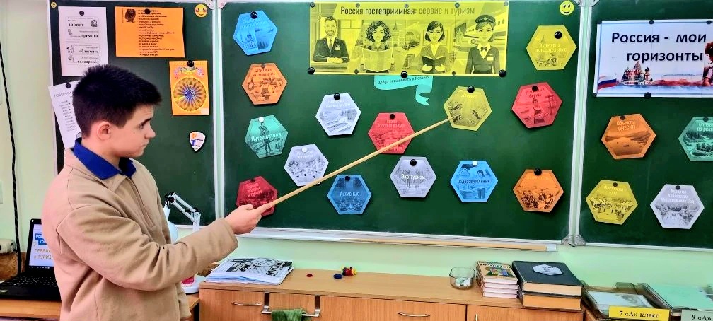 Состоялось занятие профориентационного курса «Россия — мои горизонты». Это уже двадцать первое занятие, и в этот четверг обучающиеся познакомились с темой «Россия гостеприимная: сервис и туризм». Ребята погрузились в мир профессий, которые делают путешествия комфортными, а повседневную жизнь — удобной и яркой.