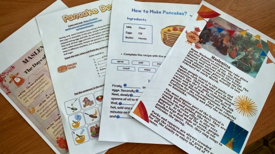 Урок начался с обсуждения любимых русских праздников, и как только на экране появилось изображение румяных блинов, ребята без труда определили тему занятия — Масленица, или как ее называют в англоязычном мире, Pancake Week. В ходе беседы мы ввели и активно использовали ключевую лексику, а также названия дней масленичной недели и их традиции. Обучающиеся работали с разрезными карточками, сопоставляя английские названия дней с соответствующими обычаями, что способствовало эффективному запоминанию нового материала.