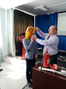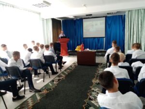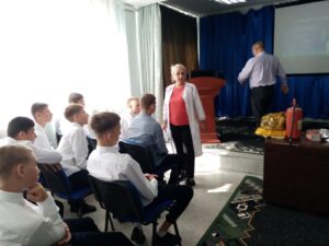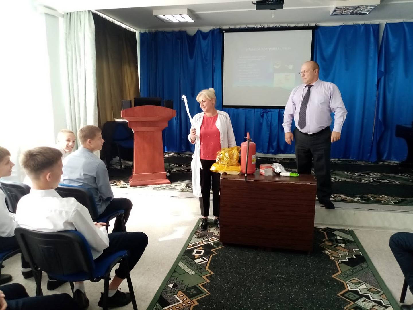На уроке, обучающиеся посмотрели видеоролики о правилах пожарной безопасности, правилах поведения на железнодорожном и авиатранспорте. Среди обучающихся был проведен конкурс на знание и умение применения средств индивидуальной защиты (само спасатели) при чрезвычайных ситуациях. Обучающиеся познакомились с устройством приборов для определения АХОВ (активных химических отравляющих веществ) и радиоактивного излучения. Отрабатывались умения применения первичных средств пожаротушения (огнетушители ОП – 5) Так же обучающиеся узнали устройство и принцип работы различных автоматических систем пожаротушения. Из курса ОБЖ обучающиеся вспомнили правила поведения при чрезвычайных ситуациях. Прослушали лекцию штатного медицинского работника, отработали навыки оказания первой доврачебной помощи при различного рода травмах.