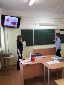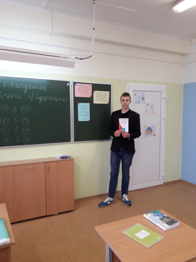 Обучающиеся 10А класса обсудили такие понятия, как «гражданин», «гражданство», «военная обязанность», «альтернативная военная служба». Вместе с учителем учились решать задачи, касающиеся гражданства и его оформления. Вниманию обучающихся было предложено просмотр видеоролика «Я – гражданин России!» Примечательно, что эпиграфом к уроку стало стихотворение «Я – гражданин России» обучающегося 10А класса Королева Алексея.