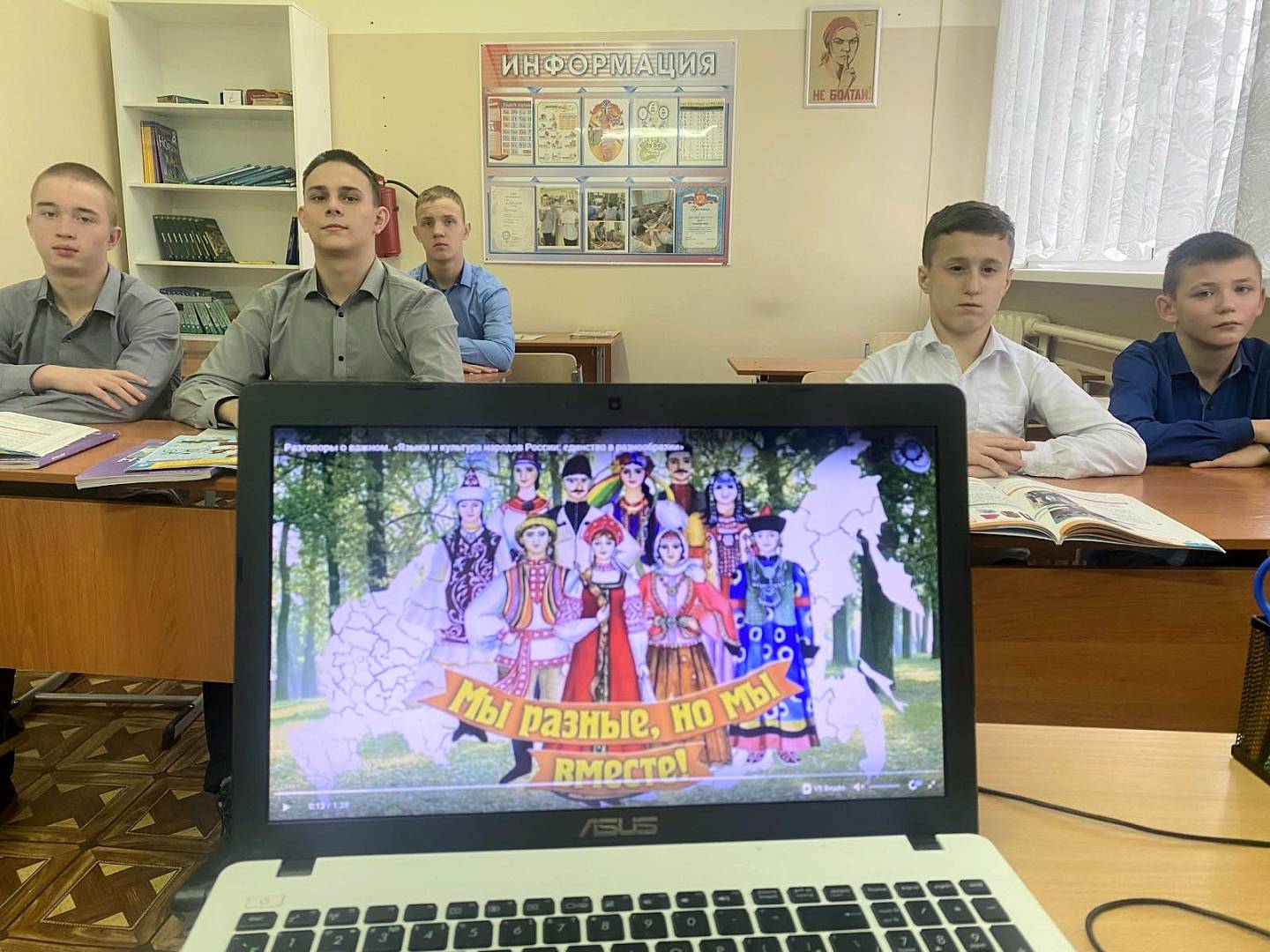Обучающиеся обсуждали то, какое значение имеет государственный язык Российской Федерации, какие особенности имеют языки народов Российской Федерации, какую роль играет родной язык в жизни каждого человека; о некоторых особенностях культур народов Российской Федерации. Дети узнали, что большинство народов России на протяжении веков формировалось на территории современного Российского государства и внесло свой вклад в развитие государственности и культуры. Мы очень разные, но веками живём вместе, вместе учимся и работаем, хорошо друг друга понимаем и составляем единое целое. Мы, граждане России, – единая общность, россияне. Велика роль русского языка в жизни, истории и культуре нашей страны. Ребята выполняли интерактивные задания, работали в группах и отвечали на вопросы на тему «Народов много – страна одна!», узнавая много нового и интересного.