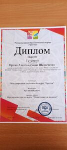 Руководитель кружка за сценарий, проведение и полученный результат награждена Дипломом Лауреата 1 степени Международного творческого конкурса «Престиж».