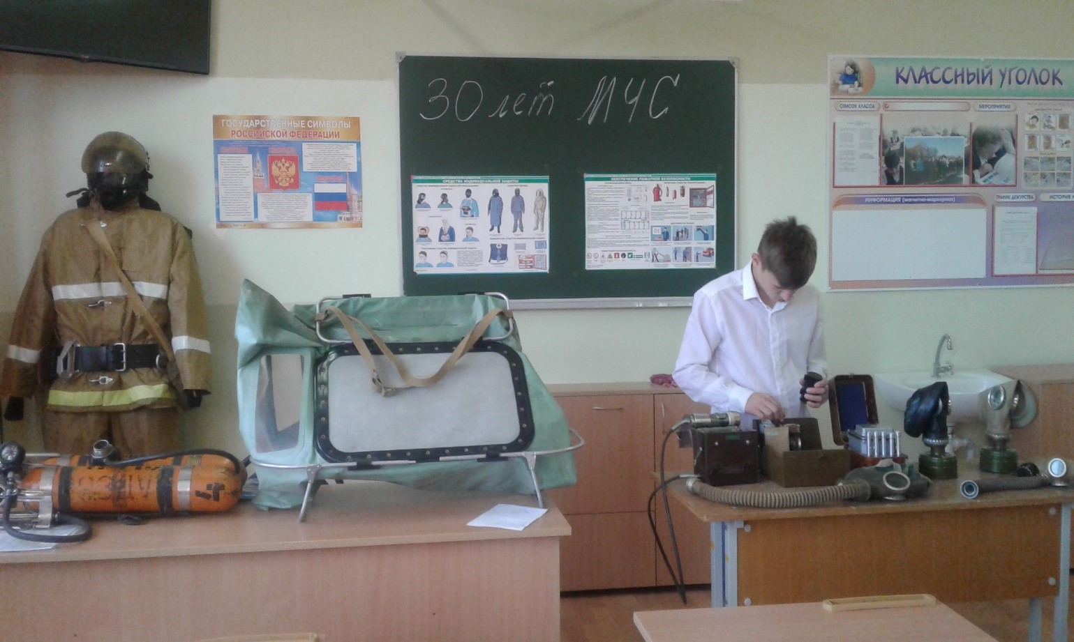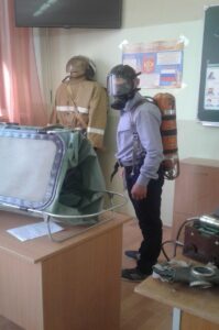 В ходе урока обучающиеся узнали историю создания войск ГО и служб МЧС России, познакомились и примерили на себя снаряжение бойцов радиационной разведки, узнали принцип работы и предназначение приборов проведения химической разведки. Боевое снаряжение пожарного, костюм и автономный дыхательный аппарат особо заинтересовали обучающихся. Они наглядно увидели и ощутили тяжесть и опасность работы пожарного, вес не полного снаряжения огнеборца весит около 30 килограммов. После окончания теоретического занятия, была проведена учебно-тренировочная эвакуация, по вводной – Сильное задымление на верхних этажах школы. Эвакуировалось 100 % обучающихся и сотрудников. Время эвакуации – 2 минуты 30 секунд. Условно были применены первичные средства пожаротушения, привлечены к тренировке личный состав добровольной пожарной дружины Неманского СУВУ.