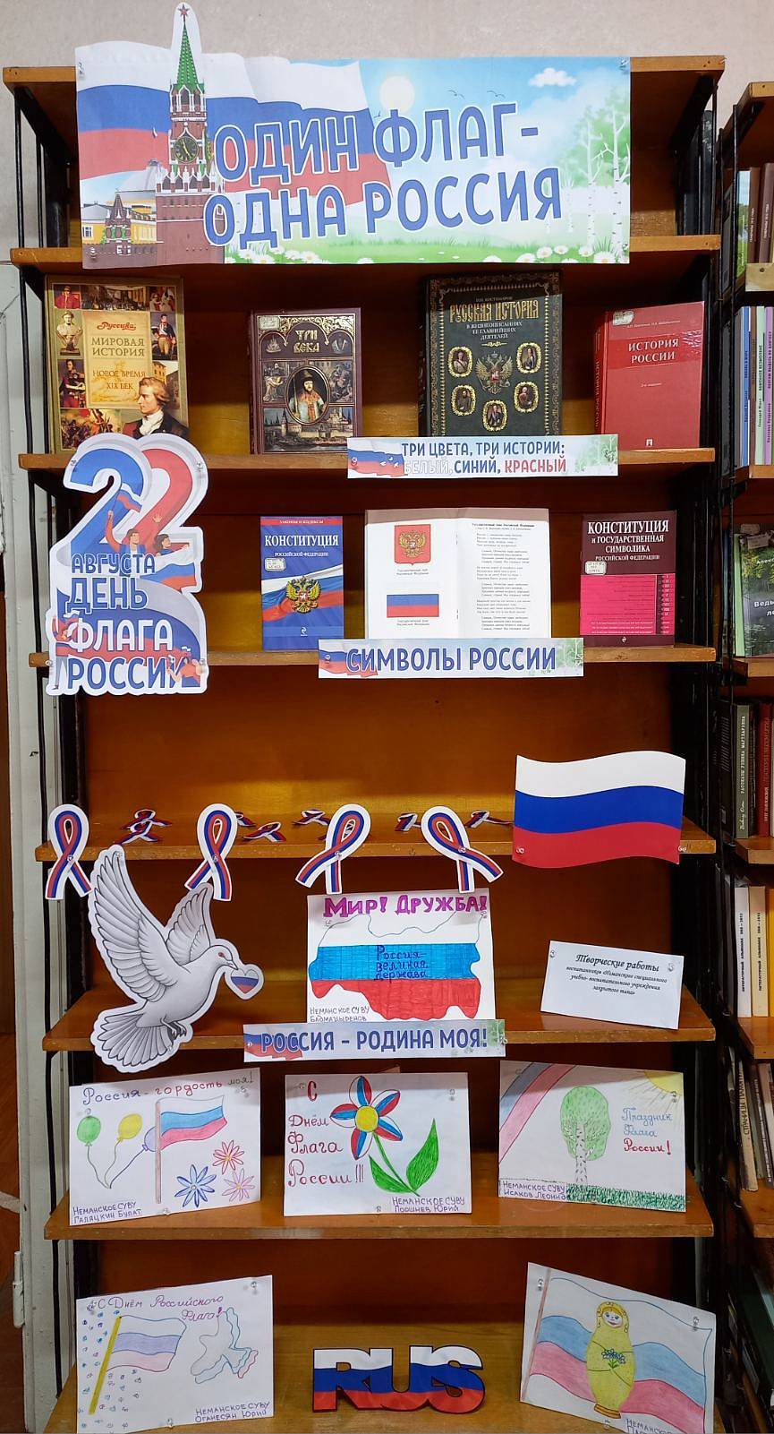 День Российского флага – это праздник всех поколений россиян, дань уважения истории великой страны. Этот праздник вызывает в нас чувство гордости за свою великую страну, за наших соотечественников. В честь этой знаменательной даты в библиотеке Неманского СУВУ ребята, переполненные чувством гордости за Родину и искренне любящие её, нарисовали рисунки, в которых ключевым элементом стал флаг нашей страны и передали их в городскую библиотеку г Немана. Своими работами ребята показали целостность и непобедимость нашей великой и могучей страны, проявили дань уважения к нашей истории. Ведь патриотизм и любовь к родной стране начинается с уважения и принятия ее символов, одним из которых является флаг.