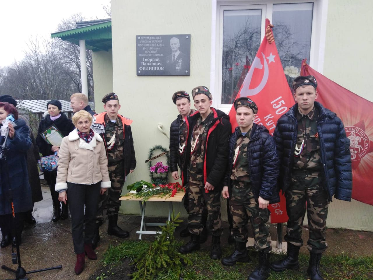 Ломоносова д. 6. состоялось торжественное открытие памятной доски Филиппову Георгию Павловичу, Почётному гражданину города Немана, участнику Великой Отечественной войны, ветерану становления Калининградской области, ветерану труда. Обучающиеся нашего учреждения приняли участие в этом торжественном мероприятии. Георгию Павловичу сегодня исполнилось бы 98 лет, а при взятии Рагнита ему было 21 год. С 1946 года он возглавлял Неманский целлюлозно-бумажный комбинат, участвовал в строительстве многих зданий г.Неман. А последние годы своей жизни посвятил работе с молодежью, передавая свой бесценный опыт, воспитывая в молодом поколении силу духа, отвагу и мужество!