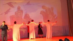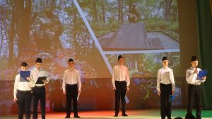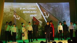 Далее всех неравнодушных к этой великой памятной дате пригласили в большой зал ДК на литературно-музыкальную композицию «В историю вписано имя», которую подготовили театральная студия СУВУ г.Неман под руководством Салаева Эльмана Эльдаровича, совместно с Молодёжным театром «Молодая гвардия» г.Советск. Литературные театральные зарисовки на военную тематику, песни военных лет, импровизированная игра на кларнете, стихотворения – всё это прошло через сердце каждого присутствующего. Ребята нашего учреждения, в рамках литературно-музыкальной композиции вспомнили всех поименно, кто являлся участниками штурма Рагнит. Торжественный концерт подходил к концу, а память о героях взятия Рагнита осталась навечно!