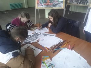 Почтив память павших у Братской могилы минутой молчания, всех ждало торжественное продолжение в ДК Неман, которое также не обошлось без нашего участия. В фоей Дворца культуры каждый гость мог погрузиться в атмосферу настоящего солдатского привала с песнями, танцами, с воспоминаниями, с верой и гордостью и надеждой в сердце. Педагоги нашего учреждения, одетые в военную форму тех лет помогали приходящим сориентироваться и предлагали принять участие в мастер-классе по ИЗО, который был посвящен взятию Рагнита. Обучающиеся нашего учреждения под руководством педагога дополнительного образования Банит Марины Станиславовны, располагаясь за столами, помогали всем желающим получить навыки рисования по репродукциям военных действий, которые происходили в далеком 1945 году в Рагните. Самым маленьким предлагали раскраски с военной тематикой. Желающих принять участие в мастер-классе было много.