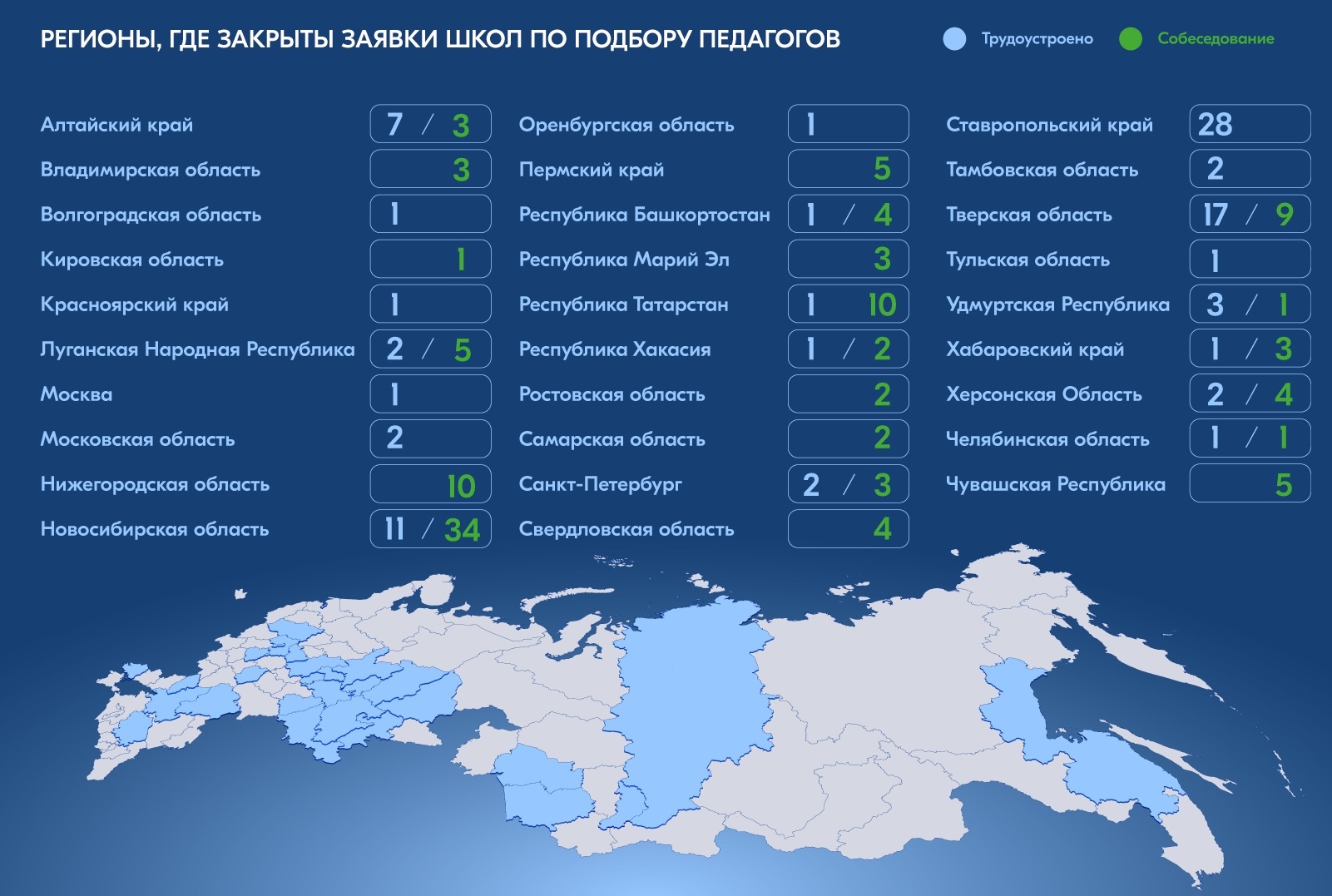 В Ставропольском крае закрыты все 28 поступивших вакансий, а в Новосибирской области и Татарстане активно проводятся собеседования с кандидатами.