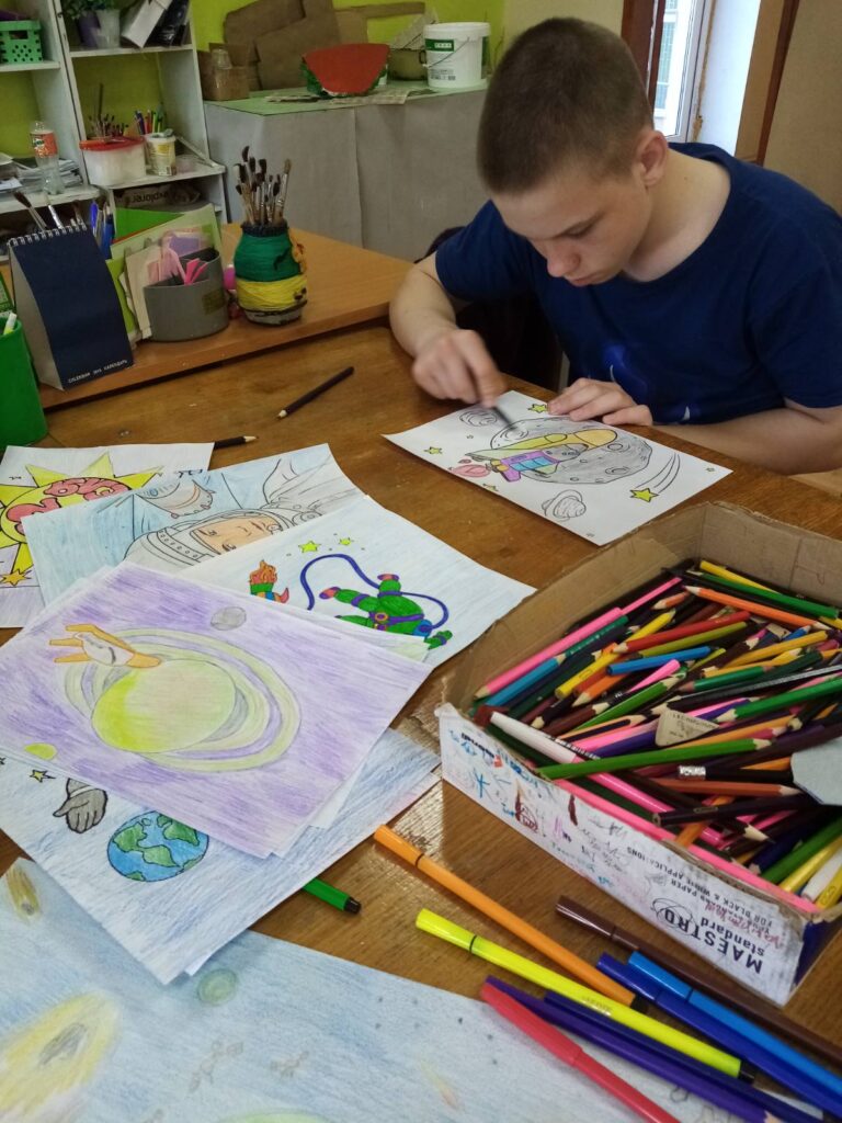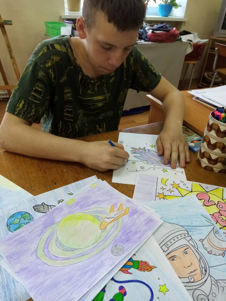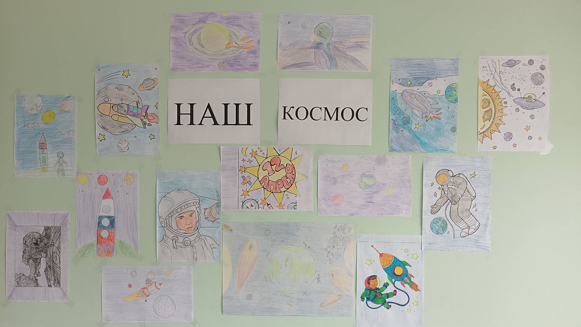 Затем прошёл творческий конкурс «Полёт фантазий». Обучающиеся с педагогом дополнительного образования М.С.Банит оформили выставку рисунков на тему «Наш космос».