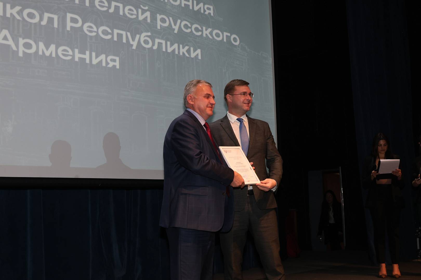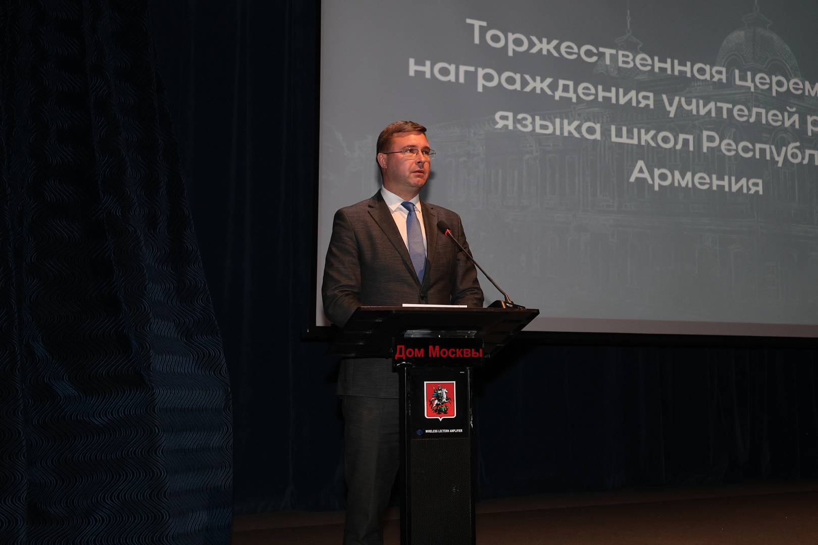 В рамках визита Андрей Корнеев посетил торжественную церемонию награждения учителей русского языка школ Республики Армения. Мероприятие прошло в Московском культурно-деловом центре «Дом Москвы в Ереване».
