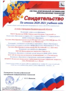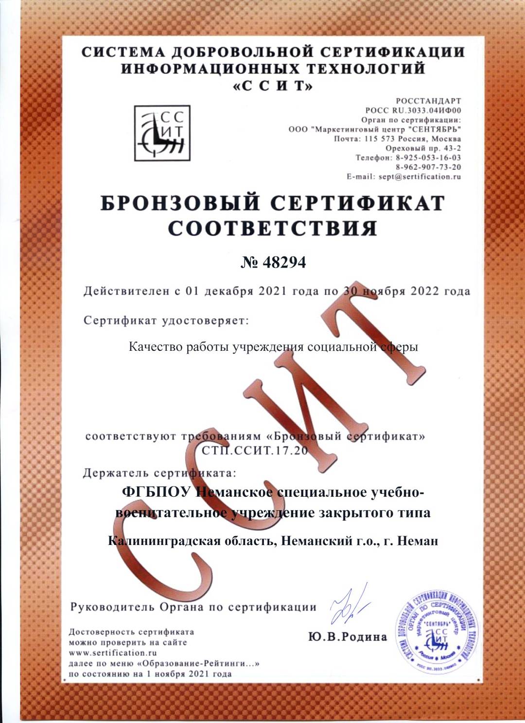 На основании данных рейтинга учреждений на 01 ноября 2021 года, который ведёт «ССИТ», Неманское СУВУ получило бронзовый сертификат соответствия, который удостоверяет качество работы учреждения социальной сферы и вошло в список лучших учреждений Калининградской области в номинации «Образование в учреждениях социальной направленности».