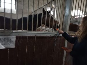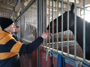 После экскурсии в музее, ребята посетили конюшни. Сегодня это целый комплекс построек с просторными конюшнями на 310 мест, оборудованных загонами. Когда рядом живые кони, как-то все остальное воспринимается поверхностно и уходит на второй план. Ребятам раздали морковь, чтобы они могли угостить и «пообщаться» с четвероногими обитателями «Георгенбурга».