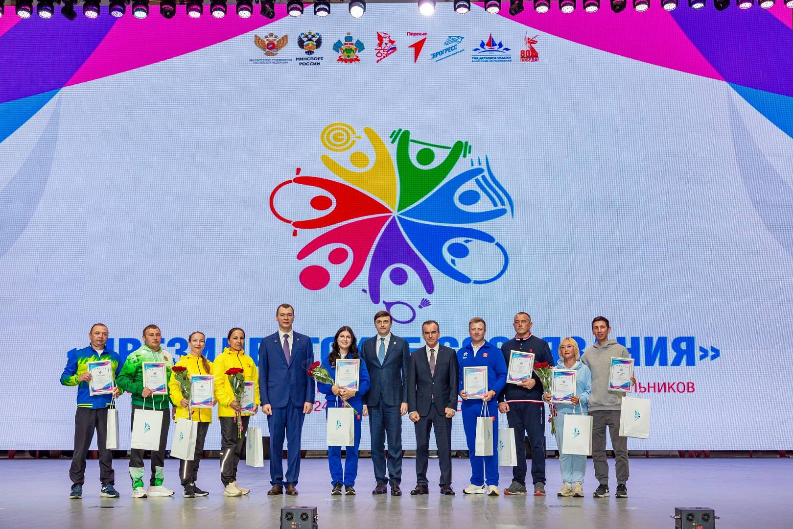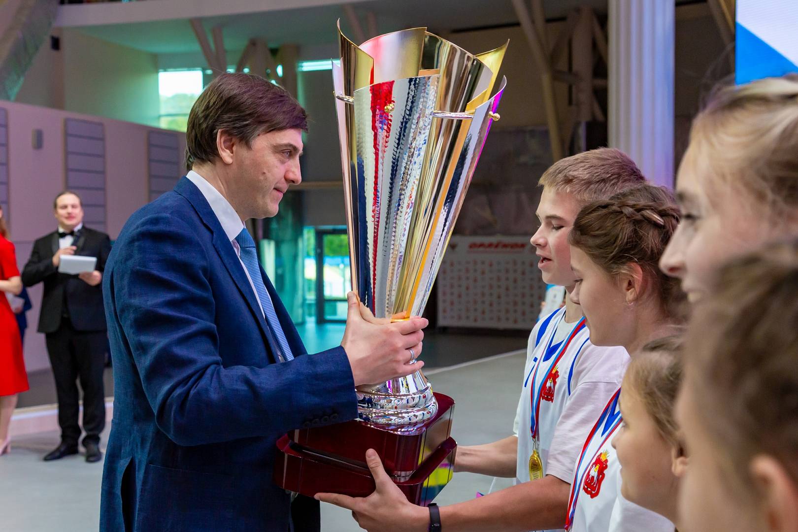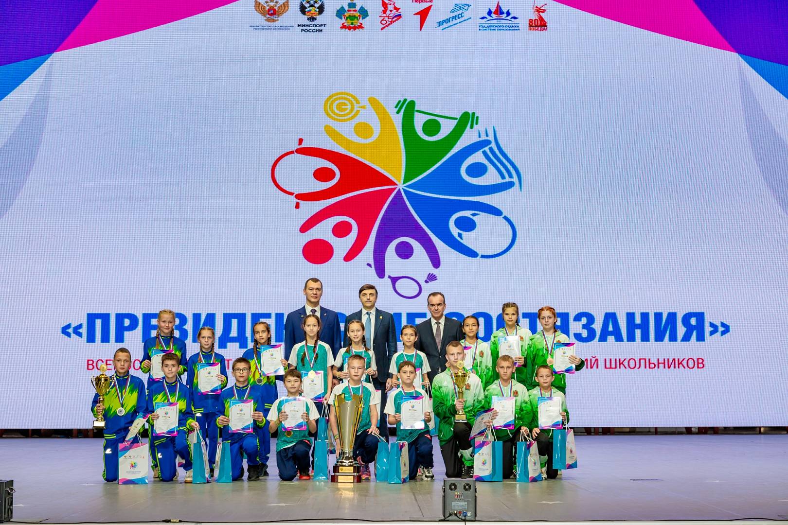 В церемонии награждения победителей и призеров «Президентских состязаний» приняли участие Министр просвещения РФ Сергей Кравцов, Министр спорта, председатель Олимпийского комитета России Михаил Дегтярев и губернатор Краснодарского края Вениамин Кондратьев.