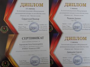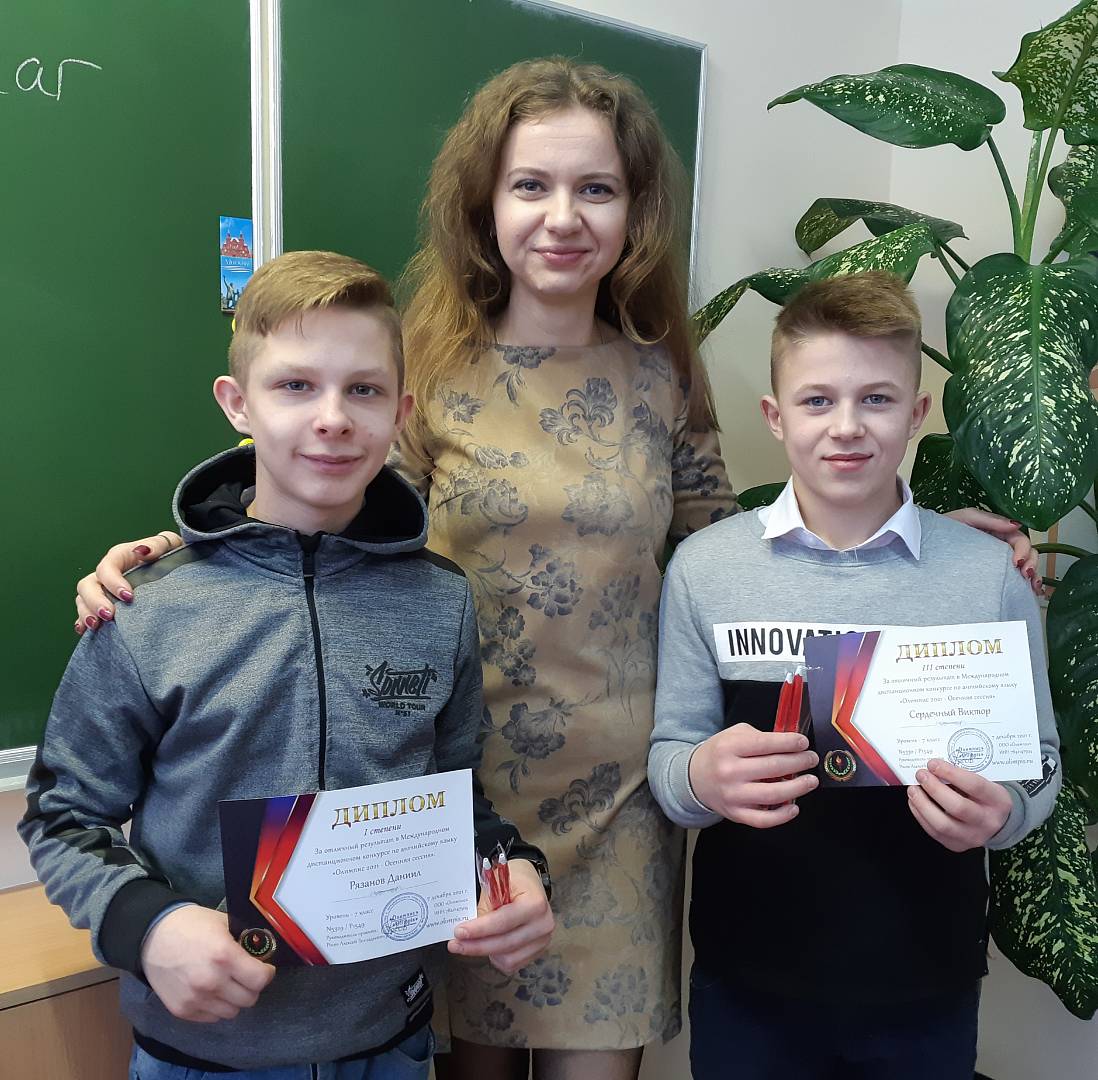 После подведения итогов места распределились следующим образом: Рязанов Д., и Давидови С., – дипломы I степени, Сердечный В. - диплом III за отличный результат в олимпиаде по английскому языку.
