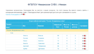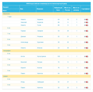 Обучающиеся не только соревновались с участниками олимпиад по все России, но и проверили свои знания по общеобразовательным предметам «Химия», «Биология» и «География». В дистанционном мероприятии приняли участие 22 обучающихся, из которых 20 обучающихся заняли 1 – 3 призовые места по Калининградской области. Обучающийся 6 «А» класса Хуснутдинов А., занял 1 место в России по предмету «География», набрав 100 максимальных баллов.