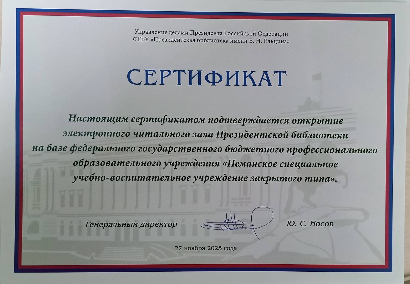 В рамках совещания состоялось торжественное вручение сертификатов об открытии электронного читального зала Президентской библиотеки. Полный доступ к фонду национального электронного хранилища теперь открыт для сотрудников и воспитанников нашего учебно-воспитательного учреждения закрытого типа, подведомственного Минпросвещению России.