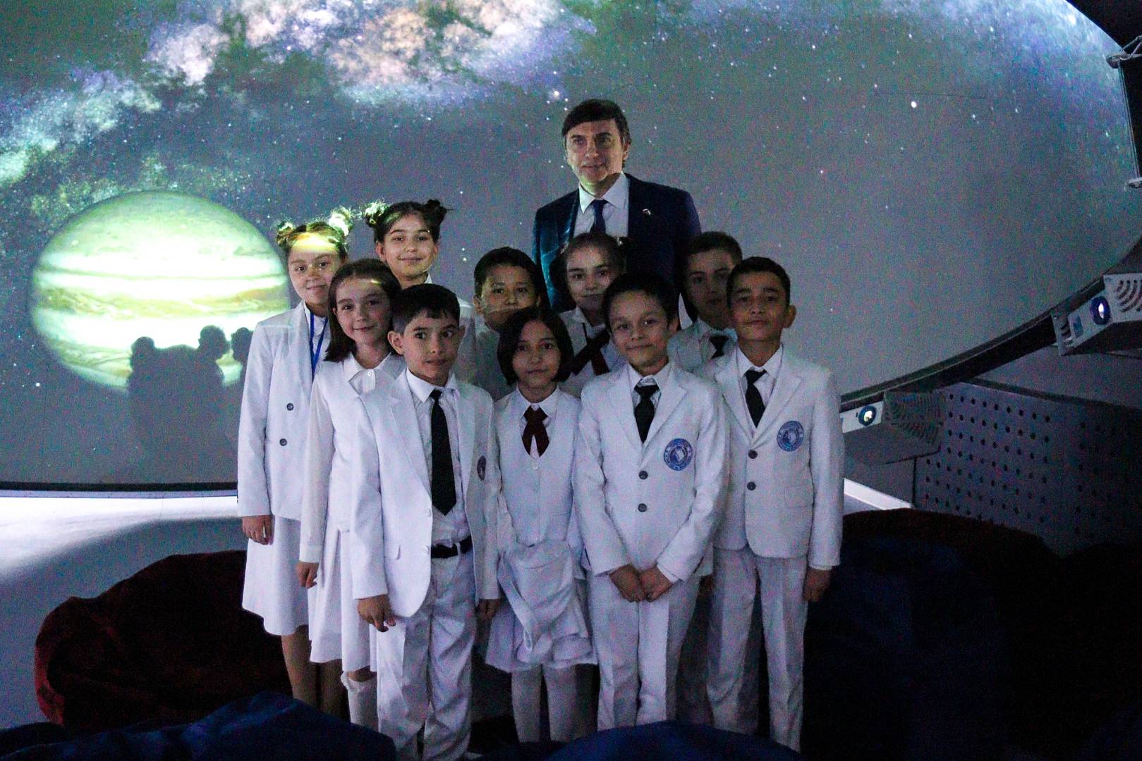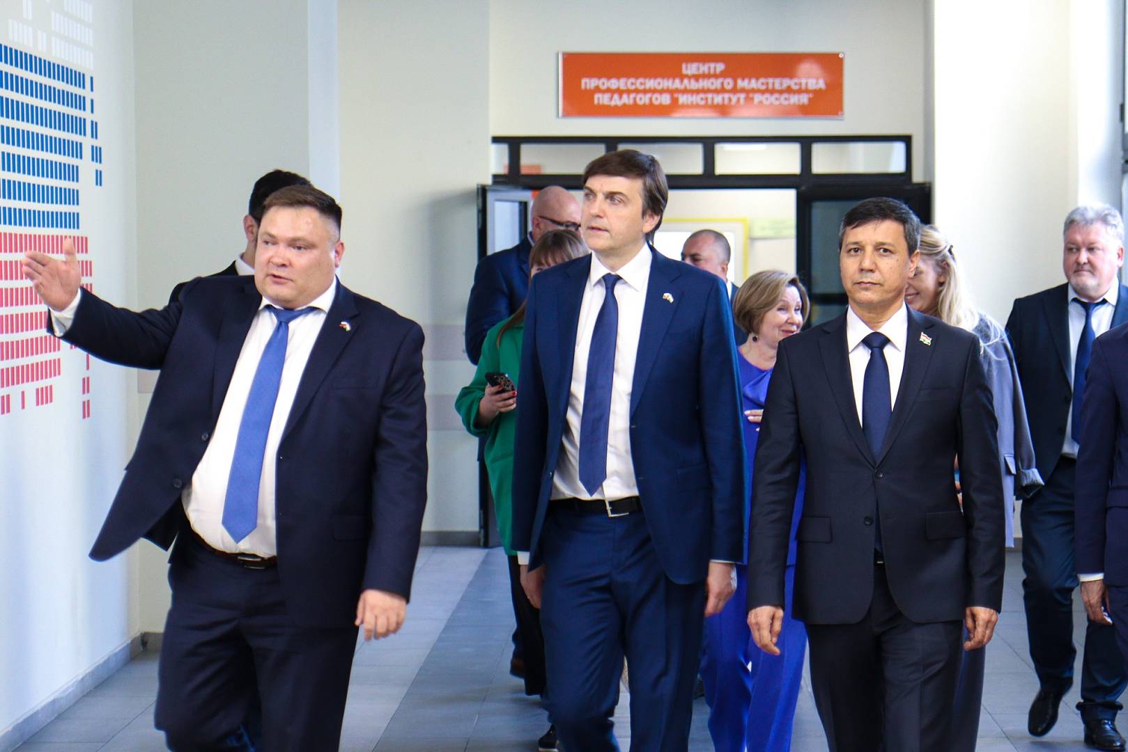 В школе имени Ю.А. Гагарина Министр просвещения осмотрел центр профессионального мастерства педагогов «Институт «Россия», библиотечно-информационный центр, залы именных аудиторий выдающихся педагогов, а также аудиторий, посвященных космонавтам – членам первого отряда космонавтов. Он также посетил школьный музей-планетарий и школьный «Кванториум».