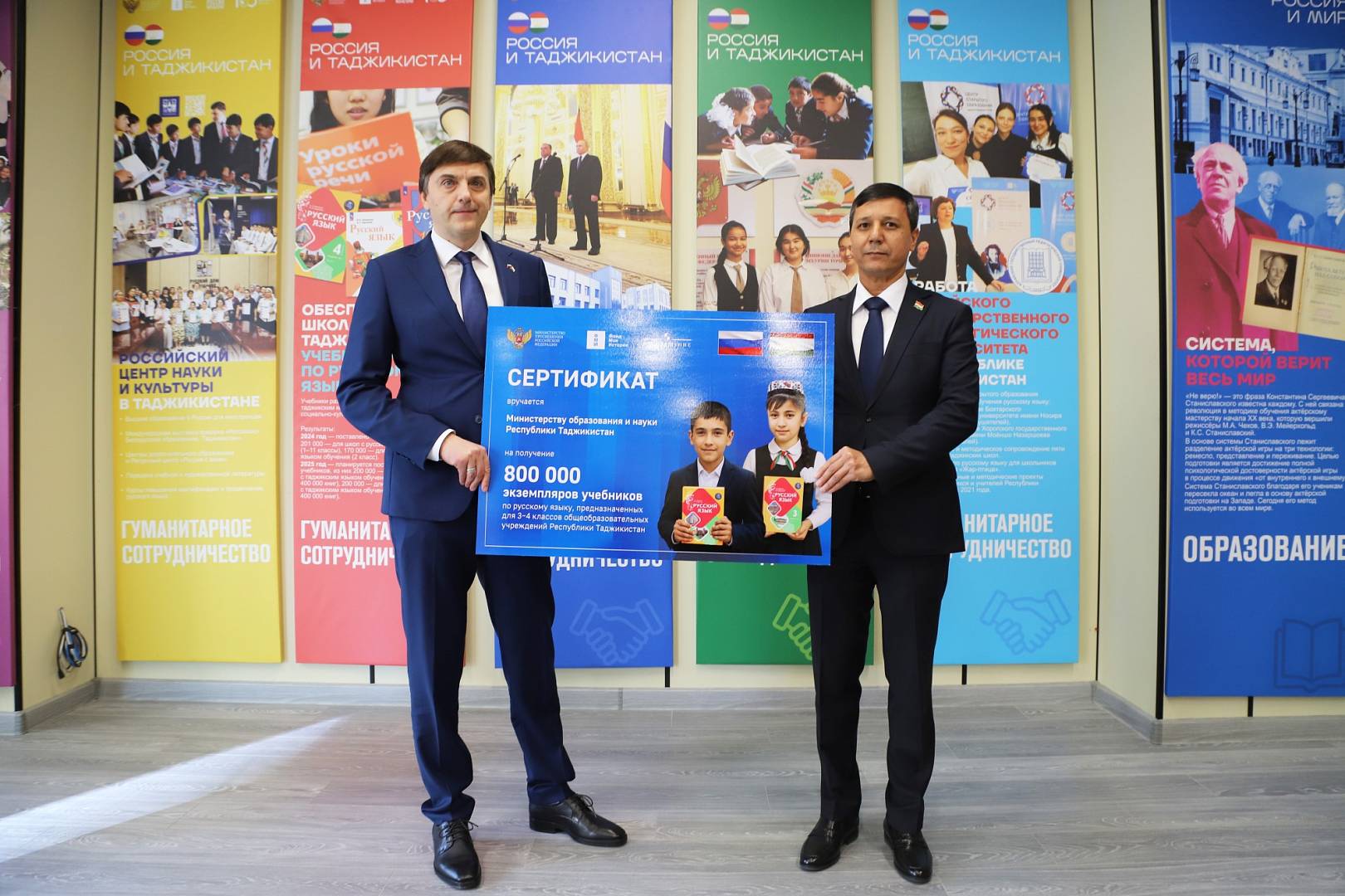 «Одно из наших ключевых направлений взаимодействия – деятельность пяти совместных российско-таджикских школ. Нельзя не отметить высокий конкурс при приеме в первые классы, который в среднем составил 22,3 человека на место, а в школу в Душанбе конкурс достиг 93 человек на место. Второе направление деятельности – подготовка и поставка учебников. Сегодня мы передаем сертификат на более чем 800 тысяч экземпляров в таджикистанские школы. Они разработаны совместным коллективом российских и таджикских авторов», – отметил Сергей Кравцов.