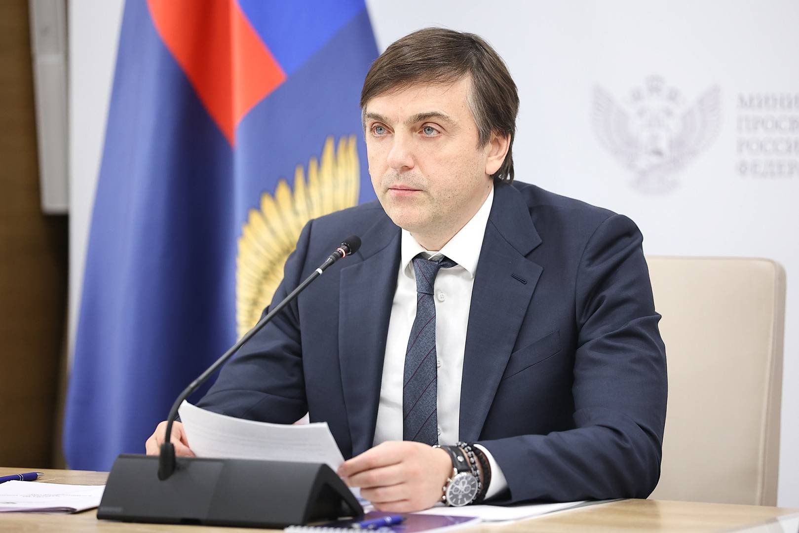 С приветственным словом к конкурсантам обратились Министр просвещения РФ Сергей Кравцов и губернатор Курской области Александр Хинштейн.