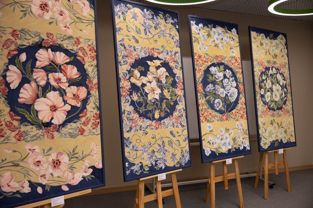 Отметим, что цветочные росписи студентов выполнены в технике батик. Она сочетает в себе акварель и графику и требует колоссальных усилий молодого художника.
